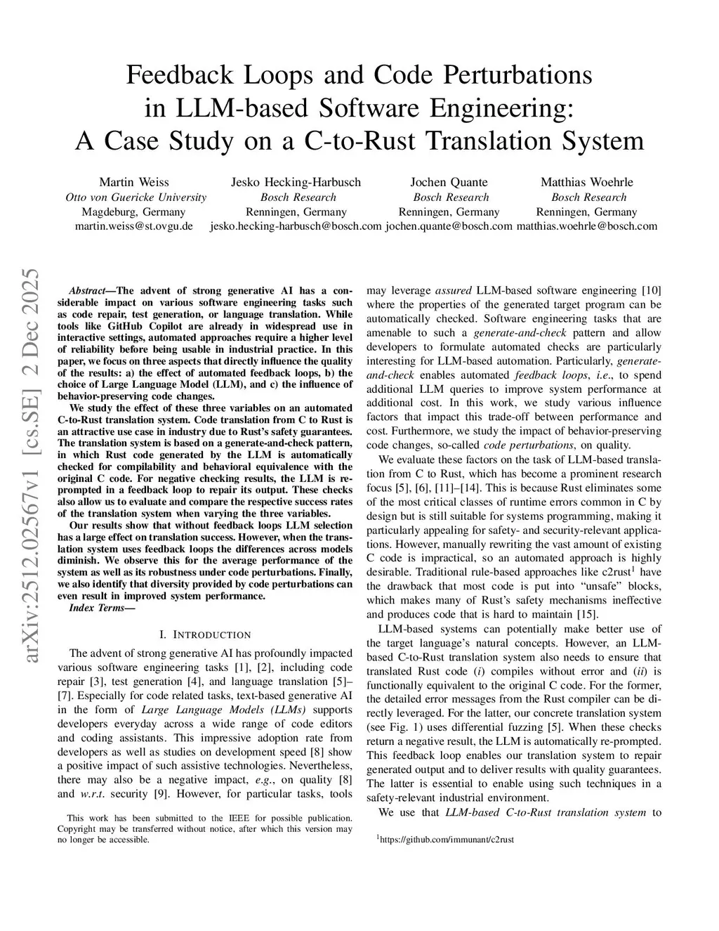 The advent of strong generative AI has a considerable impact on various software engineering tasks such as code repair, test generation, or language translation. While tools like GitHub Copilot are already in widespread use in interactive settings, automated approaches require a higher level of reliability before being usable in industrial practice. In this paper, we focus on three aspects that directly influence the quality of the results: a) the effect of automated feedback loops, b) the choice of Large Language Model (LLM), and c) the influence of behavior-preserving code changes.We study the effect of these three variables on an automated C-to-Rust translation system. Code translation from C to Rust is an attractive use case in industry due to Rust's safety guarantees. The translation system is based on a generate-and-check pattern, in which Rust code generated by the LLM is automatically checked for compilability and behavioral equivalence with the original C code. For negative checking results, the LLM is re-prompted in a feedback loop to repair its output. These checks also allow us to evaluate and compare the respective success rates of the translation system when varying the three variables.Our results show that without feedback loops LLM selection has a large effect on translation success. However, when the translation system uses feedback loops the differences across models diminish. We observe this for the average performance of the system as well as its robustness under code perturbations. Finally, we also identify that diversity provided by code perturbations can even result in improved system performance.