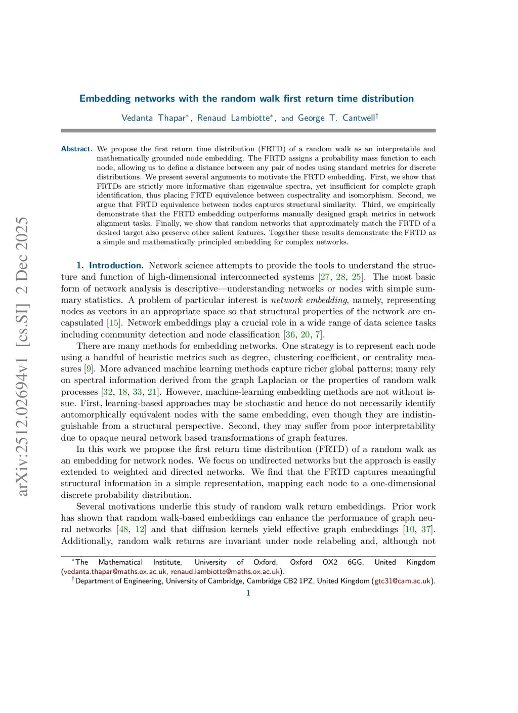 We propose the first return time distribution (FRTD) of a random walk as an interpretable and mathematically grounded node embedding. The FRTD assigns a probability mass function to each node, allowing us to define a distance between any pair of nodes using standard metrics for discrete distributions. We present several arguments to motivate the FRTD embedding. First, we show that FRTDs are strictly more informative than eigenvalue spectra, yet insufficient for complete graph identification, thus placing FRTD equivalence between cospectrality and isomorphism. Second, we argue that FRTD equivalence between nodes captures structural similarity. Third, we empirically demonstrate that the FRTD embedding outperforms manually designed graph metrics in network alignment tasks. Finally, we show that random networks that approximately match the FRTD of a desired target also preserve other salient features. Together these results demonstrate the FRTD as a simple and mathematically principled embedding for complex networks.