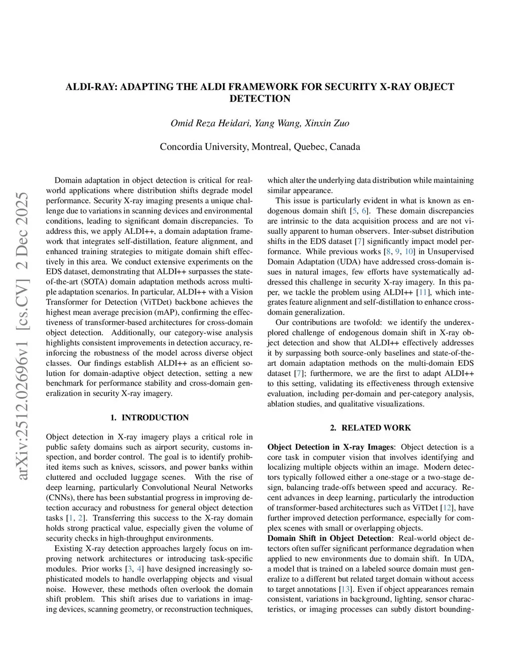 Domain adaptation in object detection is critical for real-world applications where distribution shifts degrade model performance. Security X-ray imaging presents a unique challenge due to variations in scanning devices and environmental conditions, leading to significant domain discrepancies. To address this, we apply ALDI++, a domain adaptation framework that integrates self-distillation, feature alignment, and enhanced training strategies to mitigate domain shift effectively in this area. We conduct extensive experiments on the EDS dataset, demonstrating that ALDI++ surpasses the state-of-the-art (SOTA) domain adaptation methods across multiple adaptation scenarios. In particular, ALDI++ with a Vision Transformer for Detection (ViTDet) backbone achieves the highest mean average precision (mAP), confirming the effectiveness of transformer-based architectures for cross-domain object detection. Additionally, our category-wise analysis highlights consistent improvements in detection accuracy, reinforcing the robustness of the model across diverse object classes. Our findings establish ALDI++ as an efficient solution for domain-adaptive object detection, setting a new benchmark for performance stability and cross-domain generalization in security X-ray imagery.