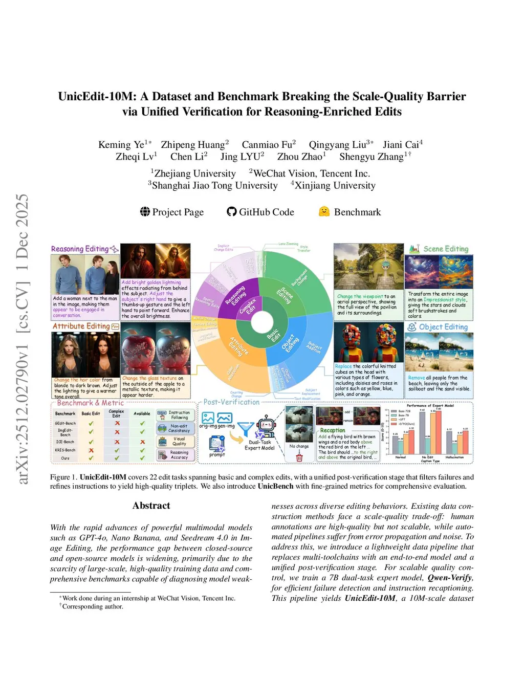 With the rapid advances of powerful multimodal models such as GPT-4o, Nano Banana, and Seedream 4.0 in Image Editing, the performance gap between closed-source and open-source models is widening, primarily due to the scarcity of large-scale, high-quality training data and comprehensive benchmarks capable of diagnosing model weaknesses across diverse editing behaviors. Existing data construction methods face a scale-quality trade-off: human annotations are high-quality but not scalable, while automated pipelines suffer from error propagation and noise. To address this, we introduce a lightweight data pipeline that replaces multi-toolchains with an end-to-end model and a unified post-verification stage. For scalable quality control, we train a 7B dual-task expert model, \textbf{Qwen-Verify}, for efficient failure detection and instruction recaptioning. This pipeline yields \textbf{UnicEdit-10M}, a 10M-scale dataset spanning diverse basic and complex editing tasks. We also propose \textbf{UnicBench}, a general benchmark that extends beyond basic edits to explicitly assess spatial and knowledge-driven reasoning. To enable fine-grained diagnosis, we introduce novel metrics, including \textit{Non-edit Consistency} and \textit{Reasoning Accuracy}. Our analysis of mainstream models on UnicBench reveals their limitations and provides clear directions for future research.