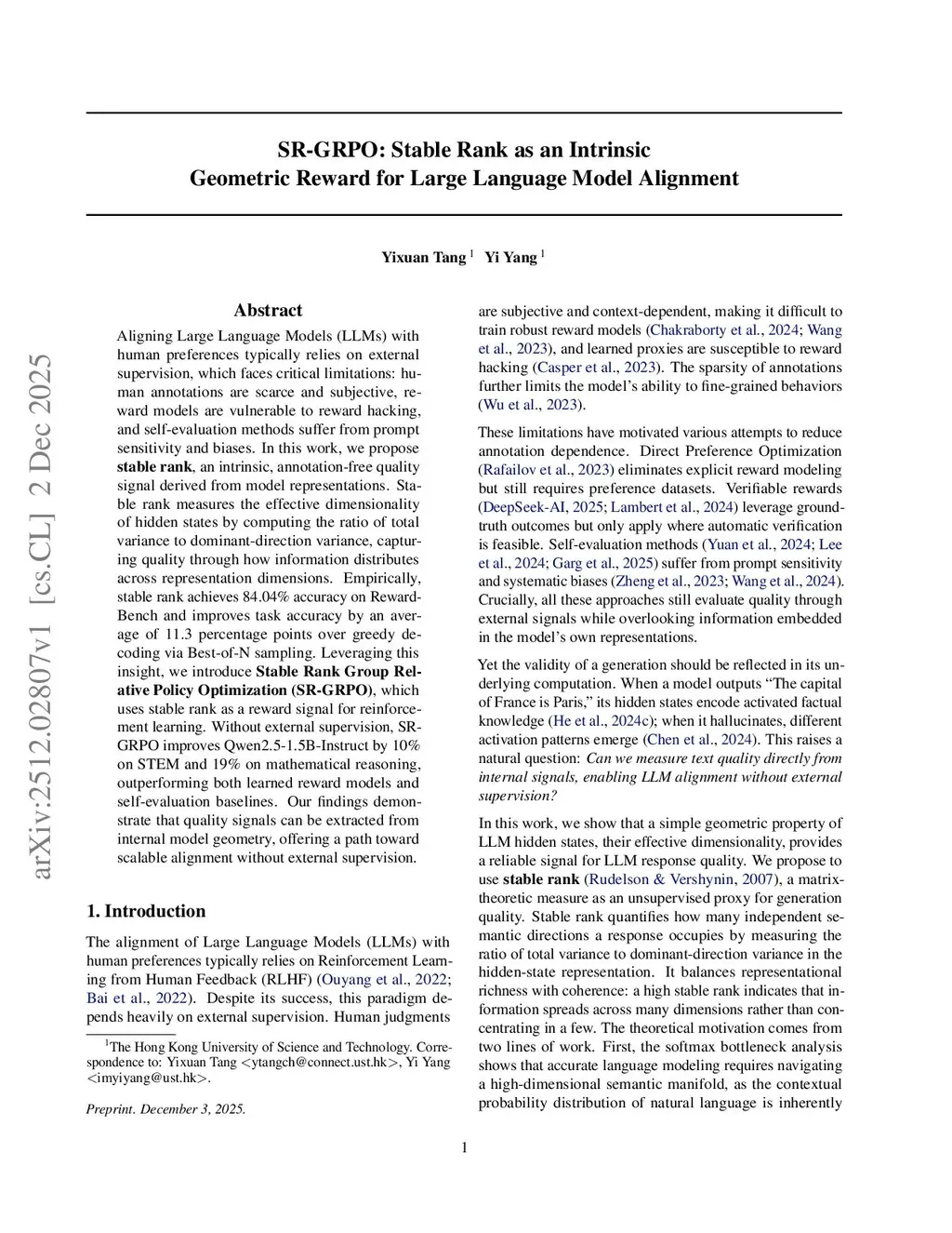 Aligning Large Language Models (LLMs) with human preferences typically relies on external supervision, which faces critical limitations: human annotations are scarce and subjective, reward models are vulnerable to reward hacking, and self-evaluation methods suffer from prompt sensitivity and biases. In this work, we propose stable rank, an intrinsic, annotation-free quality signal derived from model representations. Stable rank measures the effective dimensionality of hidden states by computing the ratio of total variance to dominant-direction variance, capturing quality through how information distributes across representation dimensions. Empirically, stable rank achieves 84.04% accuracy on RewardBench and improves task accuracy by an average of 11.3 percentage points over greedy decoding via Best-of-N sampling. Leveraging this insight, we introduce Stable Rank Group Relative Policy Optimization (SR-GRPO), which uses stable rank as a reward signal for reinforcement learning. Without external supervision, SR-GRPO improves Qwen2.5-1.5B-Instruct by 10% on STEM and 19% on mathematical reasoning, outperforming both learned reward models and self-evaluation baselines. Our findings demonstrate that quality signals can be extracted from internal model geometry, offering a path toward scalable alignment without external supervision.