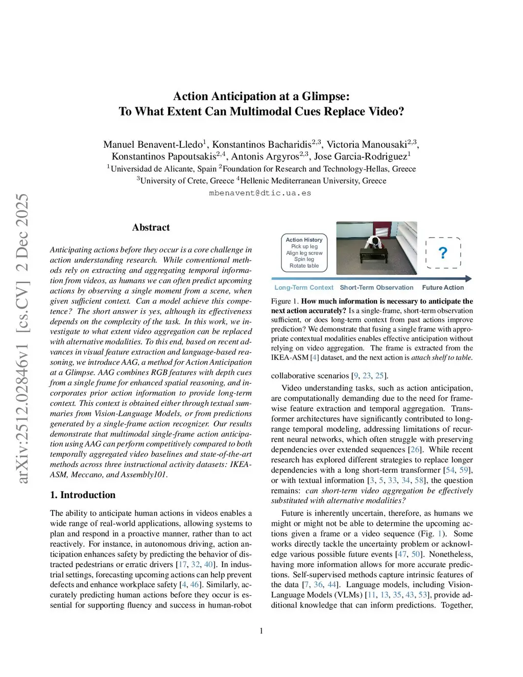 Anticipating actions before they occur is a core challenge in action understanding research. While conventional methods rely on extracting and aggregating temporal information from videos, as humans we can often predict upcoming actions by observing a single moment from a scene, when given sufficient context. Can a model achieve this competence? The short answer is yes, although its effectiveness depends on the complexity of the task. In this work, we investigate to what extent video aggregation can be replaced with alternative modalities. To this end, based on recent advances in visual feature extraction and language-based reasoning, we introduce AAG, a method for Action Anticipation at a Glimpse. AAG combines RGB features with depth cues from a single frame for enhanced spatial reasoning, and incorporates prior action information to provide long-term context. This context is obtained either through textual summaries from Vision-Language Models, or from predictions generated by a single-frame action recognizer. Our results demonstrate that multimodal single-frame action anticipation using AAG can perform competitively compared to both temporally aggregated video baselines and state-of-the-art methods across three instructional activity datasets: IKEA-ASM, Meccano, and Assembly101.