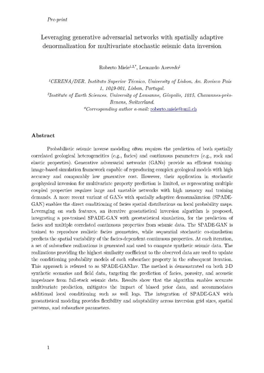 Probabilistic seismic inverse modeling often requires the prediction of both spatially correlated geological heterogeneities (e.g., facies) and continuous parameters (e.g., rock and elastic properties). Generative adversarial networks (GANs) provide an efficient training-image-based simulation framework capable of reproducing complex geological models with high accuracy and comparably low generative cost. However, their application in stochastic geophysical inversion for multivariate property prediction is limited, as representing multiple coupled properties requires large and unstable networks with high memory and training demands. A more recent variant of GANs with spatially adaptive denormalization (SPADE-GAN) enables the direct conditioning of facies spatial distributions on local probability maps. Leveraging on such features, an iterative geostatistical inversion algorithm is proposed, SPADE-GANInv, integrating a pre-trained SPADE-GAN with geostatistical simulation, for the prediction of facies and multiple correlated continuous properties from seismic data. The SPADE-GAN is trained to reproduce realistic facies geometries, while sequential stochastic co-simulation predicts the spatial variability of the facies-dependent continuous properties. At each iteration, a set of subsurface realizations is generated and used to compute synthetic seismic data. The realizations providing the highest similarity coefficient to the observed data are used to update the subsurface probability models in the next iteration. The method is demonstrated on both 2-D synthetic scenarios and field data, targeting the prediction of facies, porosity, and acoustic impedance from full-stack seismic data. Results show that the algorithm enables accurate multivariate prediction, mitigates the impact of biased prior data, and accommodates additional local conditioning such as well logs.