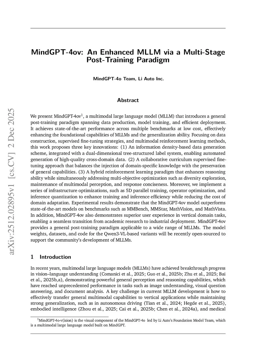 We present MindGPT-4ov, a multimodal large language model (MLLM) that introduces a general post-training paradigm spanning data production, model training, and efficient deployment. It achieves state-of-the-art performance across multiple benchmarks at low cost, effectively enhancing the foundational capabilities of MLLMs and the generalization ability. Focusing on data construction, supervised fine-tuning strategies, and multimodal reinforcement learning methods, this work proposes three key innovations: (1) An information density-based data generation scheme, integrated with a dual-dimensional tree-structured label system, enabling automated generation of high-quality cross-domain data. (2) A collaborative curriculum supervised fine-tuning approach that balances the injection of domain-specific knowledge with the preservation of general capabilities. (3) A hybrid reinforcement learning paradigm that enhances reasoning ability while simultaneously addressing multi-objective optimization such as diversity exploration, maintenance of multimodal perception, and response conciseness. Moreover, we implement a series of infrastructure optimizations, such as 5D parallel training, operator optimization, and inference quantization to enhance training and inference efficiency while reducing the cost of domain adaptation. Experimental results demonstrate that the MindGPT-4ov model outperforms state-of-the-art models on benchmarks such as MMBench, MMStar, MathVision, and MathVista. In addition, MindGPT-4ov also demonstrates superior user experience in vertical domain tasks, enabling a seamless transition from academic research to industrial deployment. MindGPT-4ov provides a general post-training paradigm applicable to a wide range of MLLMs. The model weights, datasets, and code for the Qwen3-VL-based variants will be recently open-sourced to support the community's development of MLLMs.
