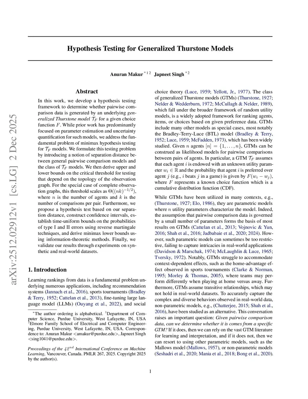 In this work, we develop a hypothesis testing framework to determine whether pairwise comparison data is generated by an underlying \emph{generalized Thurstone model} for a given choice function . While prior work has predominantly focused on parameter estimation and uncertainty quantification for such models, we address the fundamental problem of minimax hypothesis testing for models. We formulate this testing problem by introducing a notion of separation distance between general pairwise comparison models and the class of models. We then derive upper and lower bounds on the critical threshold for testing that depend on the topology of the observation graph. For the special case of complete observation graphs, this threshold scales as , where is the number of agents and is the number of comparisons per pair. Furthermore, we propose a hypothesis test based on our separation distance, construct confidence intervals, establish time-uniform bounds on the probabilities of type I and II errors using reverse martingale techniques, and derive minimax lower bounds using information-theoretic methods. Finally, we validate our results through experiments on synthetic and real-world datasets.