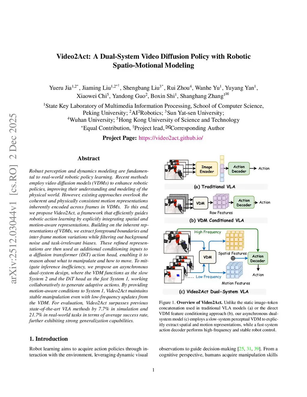 Video2Act: A Dual-System Video Diffusion Policy with Robotic Spatio-Motional Modeling