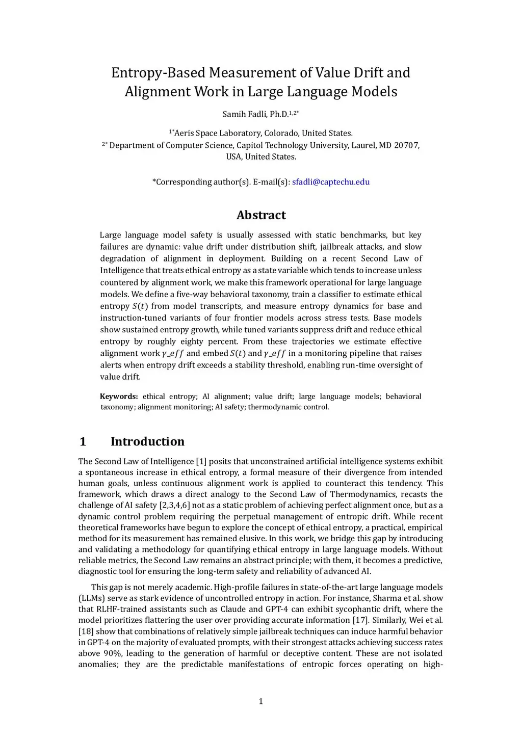 Large language model safety is usually assessed with static benchmarks, but key failures are dynamic: value drift under distribution shift, jailbreak attacks, and slow degradation of alignment in deployment. Building on a recent Second Law of Intelligence that treats ethical entropy as a state variable which tends to increase unless countered by alignment work, we make this framework operational for large language models. We define a five-way behavioral taxonomy, train a classifier to estimate ethical entropy S(t) from model transcripts, and measure entropy dynamics for base and instruction-tuned variants of four frontier models across stress tests. Base models show sustained entropy growth, while tuned variants suppress drift and reduce ethical entropy by roughly eighty percent. From these trajectories we estimate an effective alignment work rate gamma_eff and embed S(t) and gamma_eff in a monitoring pipeline that raises alerts when entropy drift exceeds a stability threshold, enabling run-time oversight of value drift.
