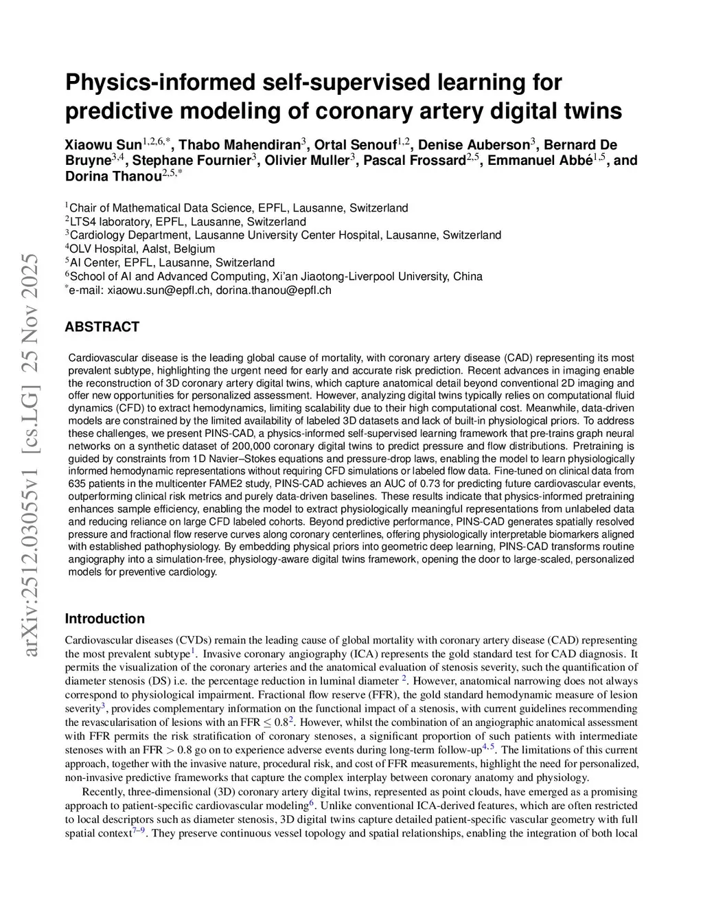 Cardiovascular disease is the leading global cause of mortality, with coronary artery disease (CAD) as its most prevalent form, necessitating early risk prediction. While 3D coronary artery digital twins reconstructed from imaging offer detailed anatomy for personalized assessment, their analysis relies on computationally intensive computational fluid dynamics (CFD), limiting scalability. Data-driven approaches are hindered by scarce labeled data and lack of physiological priors. To address this, we present PINS-CAD, a physics-informed self-supervised learning framework. It pre-trains graph neural networks on 200,000 synthetic coronary digital twins to predict pressure and flow, guided by 1D Navier-Stokes equations and pressure-drop laws, eliminating the need for CFD or labeled data. When fine-tuned on clinical data from 635 patients in the multicenter FAME2 study, PINS-CAD predicts future cardiovascular events with an AUC of 0.73, outperforming clinical risk scores and data-driven baselines. This demonstrates that physics-informed pretraining boosts sample efficiency and yields physiologically meaningful representations. Furthermore, PINS-CAD generates spatially resolved pressure and fractional flow reserve curves, providing interpretable biomarkers. By embedding physical priors into geometric deep learning, PINS-CAD transforms routine angiography into a simulation-free, physiology-aware framework for scalable, preventive cardiology.