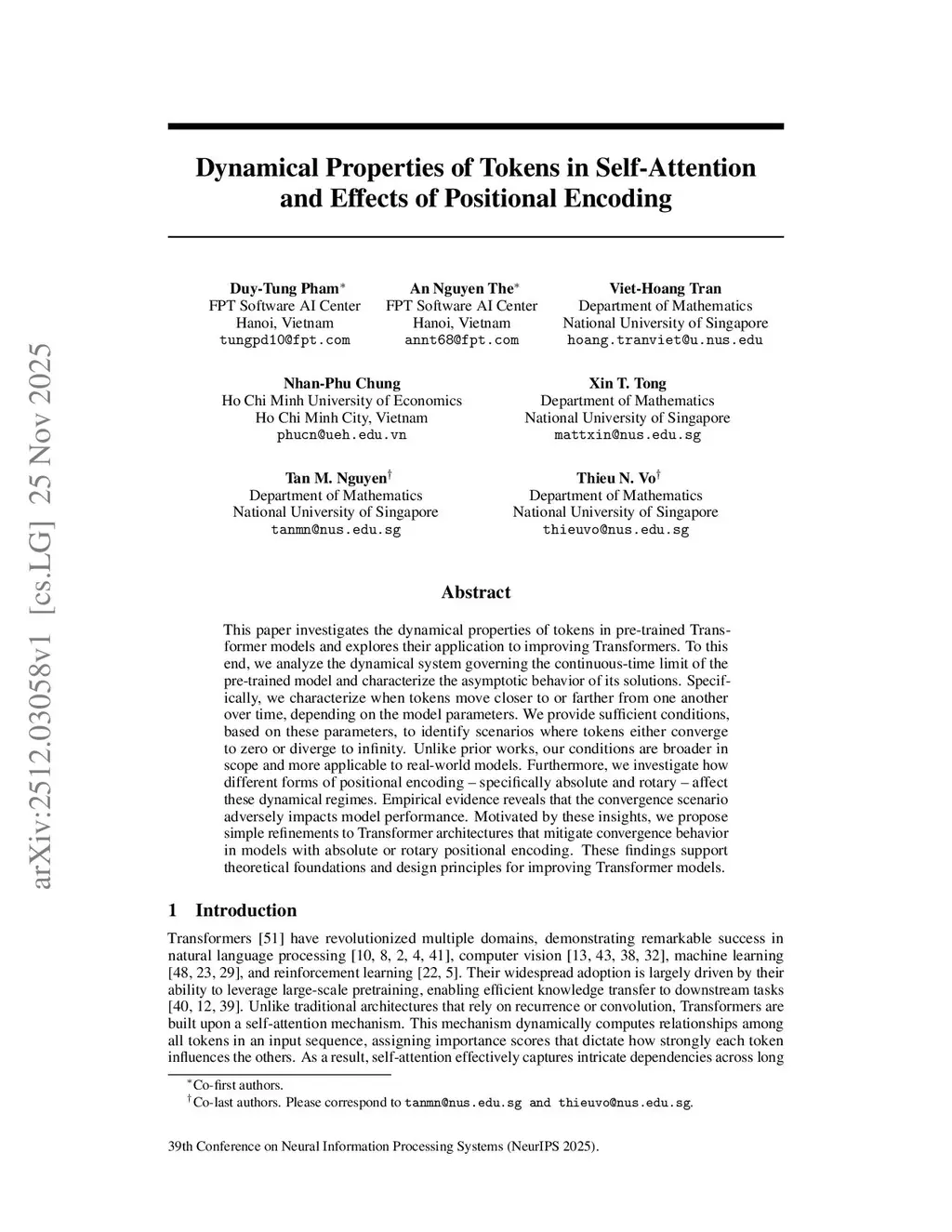 This paper investigates the dynamical properties of tokens in pre-trained Transformer models and explores their application to improving Transformers. To this end, we analyze the dynamical system governing the continuous-time limit of the pre-trained model and characterize the asymptotic behavior of its solutions. Specifically, we characterize when tokens move closer to or farther from one another over time, depending on the model parameters. We provide sufficient conditions, based on these parameters, to identify scenarios where tokens either converge to zero or diverge to infinity. Unlike prior works, our conditions are broader in scope and more applicable to real-world models. Furthermore, we investigate how different forms of positional encoding -- specifically absolute and rotary -- affect these dynamical regimes. Empirical evidence reveals that the convergence scenario adversely impacts model performance. Motivated by these insights, we propose simple refinements to Transformer architectures that mitigate convergence behavior in models with absolute or rotary positional encoding. These findings support theoretical foundations and design principles for improving Transformer models.