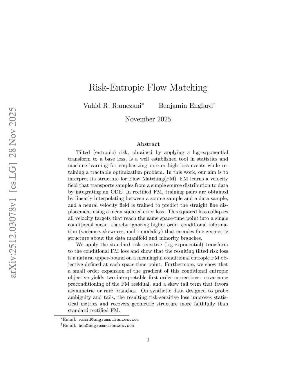 Tilted (entropic) risk, obtained by applying a log-exponential transform to a base loss, is a well established tool in statistics and machine learning for emphasizing rare or high loss events while retaining a tractable optimization problem. In this work, our aim is to interpret its structure for Flow Matching (FM). FM learns a velocity field that transports samples from a simple source distribution to data by integrating an ODE. In rectified FM, training pairs are obtained by linearly interpolating between a source sample and a data sample, and a neural velocity field is trained to predict the straight line displacement using a mean squared error loss. This squared loss collapses all velocity targets that reach the same space-time point into a single conditional mean, thereby ignoring higher order conditional information (variance, skewness, multi-modality) that encodes fine geometric structure about the data manifold and minority branches. We apply the standard risk-sensitive (log-exponential) transform to the conditional FM loss and show that the resulting tilted risk loss is a natural upper-bound on a meaningful conditional entropic FM objective defined at each space-time point. Furthermore, we show that a small order expansion of the gradient of this conditional entropic objective yields two interpretable first order corrections: covariance preconditioning of the FM residual, and a skew tail term that favors asymmetric or rare branches. On synthetic data designed to probe ambiguity and tails, the resulting risk-sensitive loss improves statistical metrics and recovers geometric structure more faithfully than standard rectified FM.