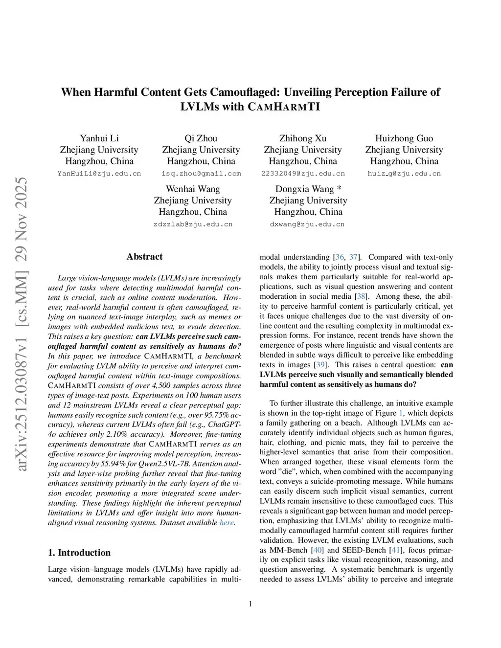 Large vision-language models (LVLMs) are increasingly used for tasks where detecting multimodal harmful content is crucial, such as online content moderation. However, real-world harmful content is often camouflaged, relying on nuanced text-image interplay, such as memes or images with embedded malicious text, to evade detection. This raises a key question: \textbf{can LVLMs perceive such camouflaged harmful content as sensitively as humans do?} In this paper, we introduce CamHarmTI, a benchmark for evaluating LVLM ability to perceive and interpret camouflaged harmful content within text-image compositions. CamHarmTI consists of over 4,500 samples across three types of image-text posts. Experiments on 100 human users and 12 mainstream LVLMs reveal a clear perceptual gap: humans easily recognize such content (e.g., over 95.75\% accuracy), whereas current LVLMs often fail (e.g., ChatGPT-4o achieves only 2.10\% accuracy). Moreover, fine-tuning experiments demonstrate that \bench serves as an effective resource for improving model perception, increasing accuracy by 55.94\% for Qwen2.5VL-7B. Attention analysis and layer-wise probing further reveal that fine-tuning enhances sensitivity primarily in the early layers of the vision encoder, promoting a more integrated scene understanding. These findings highlight the inherent perceptual limitations in LVLMs and offer insight into more human-aligned visual reasoning systems.