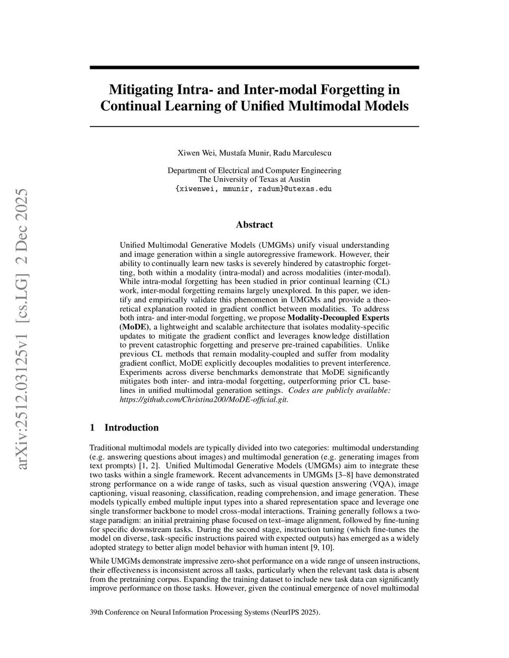 Unified Multimodal Generative Models (UMGMs) unify visual understanding and image generation within a single autoregressive framework. However, their ability to continually learn new tasks is severely hindered by catastrophic forgetting, both within a modality (intra-modal) and across modalities (inter-modal). While intra-modal forgetting has been studied in prior continual learning (CL) work, inter-modal forgetting remains largely unexplored. In this paper, we identify and empirically validate this phenomenon in UMGMs and provide a theoretical explanation rooted in gradient conflict between modalities. To address both intra- and inter-modal forgetting, we propose Modality-Decoupled Experts (MoDE), a lightweight and scalable architecture that isolates modality-specific updates to mitigate the gradient conflict and leverages knowledge distillation to prevent catastrophic forgetting and preserve pre-trained capabilities. Unlike previous CL methods that remain modality-coupled and suffer from modality gradient conflict, MoDE explicitly decouples modalities to prevent interference. Experiments across diverse benchmarks demonstrate that MoDE significantly mitigates both inter- and intra-modal forgetting, outperforming prior CL baselines in unified multimodal generation settings. Codes will be publicly available:this https URL