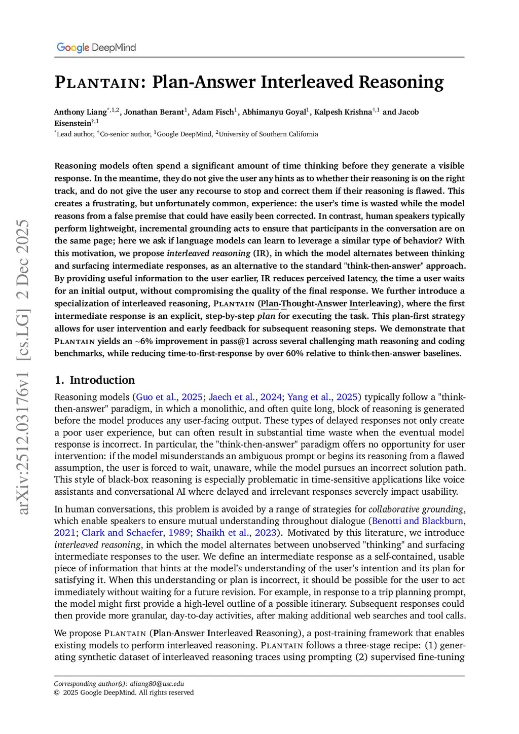 Reasoning models often spend a significant amount of time thinking before they generate a visible response. In the meantime, they do not give the user any hints as to whether their reasoning is on the right track, and do not give the user any recourse to stop and correct them if their reasoning is flawed. This creates a frustrating, but unfortunately common, experience: the user's time is wasted while the model reasons from a false premise that could have easily been corrected. In contrast, human speakers typically perform lightweight, incremental grounding acts to ensure that participants in the conversation are on the same page; here we ask if language models can learn to leverage a similar type of behavior? With this motivation, we propose interleaved reasoning (IR), in which the model alternates between thinking and surfacing intermediate responses, as an alternative to the standard "think-then-answer" approach. By providing useful information to the user earlier, IR reduces perceived latency, the time a user waits for an initial output, without compromising the quality of the final response. We further introduce a specialization of interleaved reasoning, Plantain (Plan-Thought-Answer Interleaving), where the first intermediate response is an explicit, step-by-step plan for executing the task. This plan-first strategy allows for user intervention and early feedback for subsequent reasoning steps. We demonstrate that Plantain yields an ~6% improvement in pass@1 across several challenging math reasoning and coding benchmarks, while reducing time-to-first-response by over 60% relative to think-then-answer baselines.