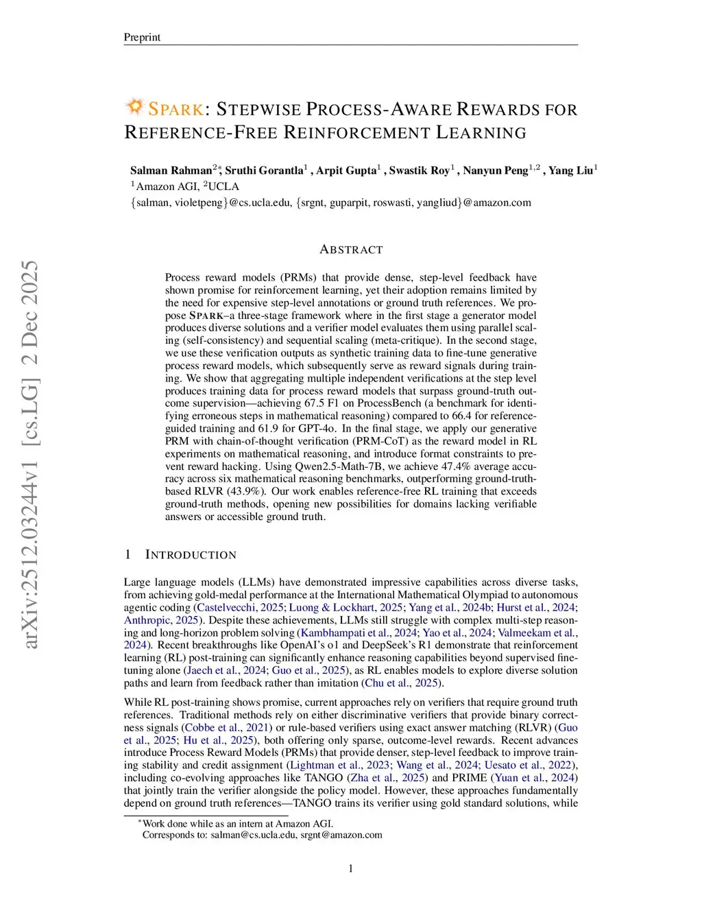 SPARK: Stepwise Process-Aware Rewards for Reference-Free Reinforcement Learning