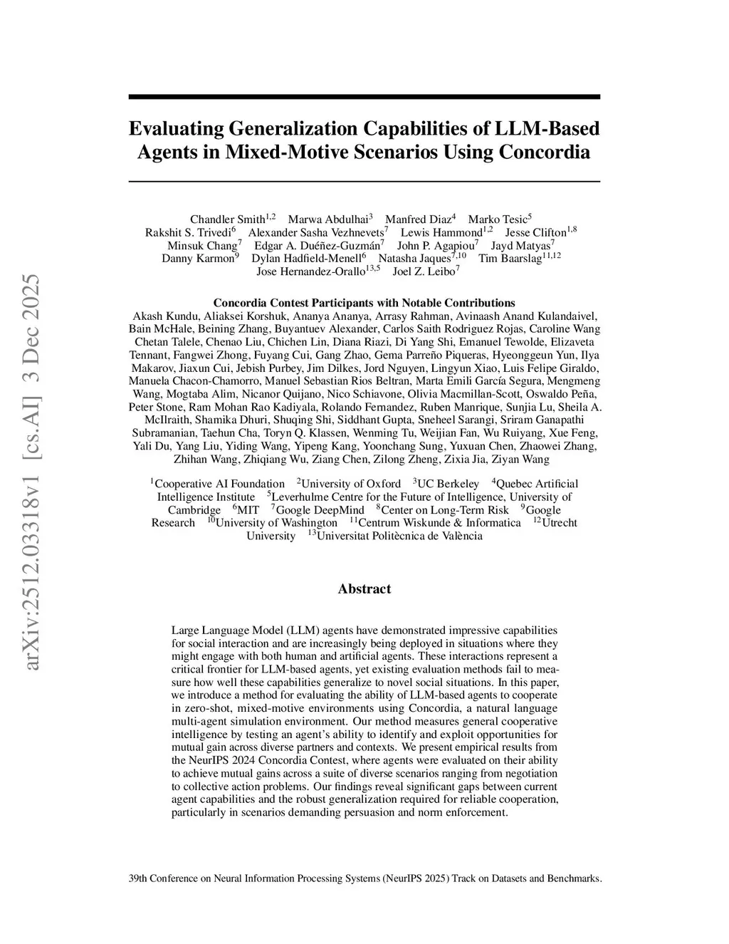 Large Language Model (LLM) agents have demonstrated impressive capabilities for social interaction and are increasingly being deployed in situations where they might engage with both human and artificial agents. These interactions represent a critical frontier for LLM-based agents, yet existing evaluation methods fail to measure how well these capabilities generalize to novel social situations. In this paper, we introduce a method for evaluating the ability of LLM-based agents to cooperate in zero-shot, mixed-motive environments using Concordia, a natural language multi-agent simulation environment. Our method measures general cooperative intelligence by testing an agent's ability to identify and exploit opportunities for mutual gain across diverse partners and contexts. We present empirical results from the NeurIPS 2024 Concordia Contest, where agents were evaluated on their ability to achieve mutual gains across a suite of diverse scenarios ranging from negotiation to collective action problems. Our findings reveal significant gaps between current agent capabilities and the robust generalization required for reliable cooperation, particularly in scenarios demanding persuasion and norm enforcement.