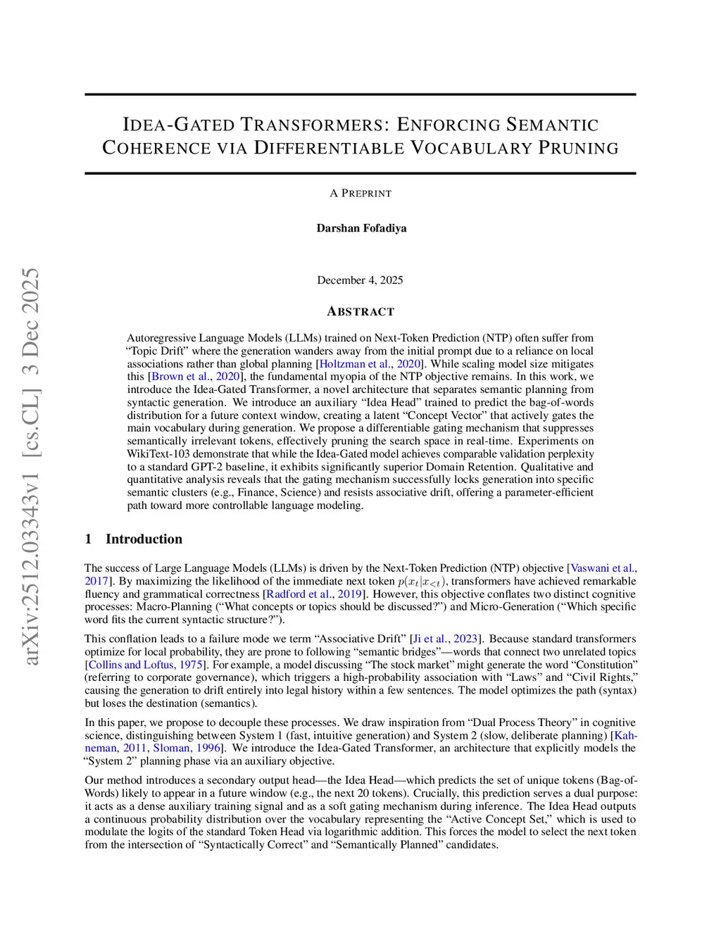 Autoregressive Language Models (LLMs) trained on Next-Token Prediction (NTP) often suffer from Topic Drift where the generation wanders away from the initial prompt due to a reliance on local associations rather than global planning. While scaling model size mitigates this, the fundamental myopia of the NTP objective remains. In this work, we introduce the Idea-Gated Transformer, a novel architecture that separates semantic planning from syntactic generation. We introduce an auxiliary Idea Head trained to predict the bag-of-words distribution for a future context window, creating a latent ``Concept Vector'' that actively gates the main vocabulary during generation. We propose a differentiable gating mechanism that suppresses semantically irrelevant tokens, effectively pruning the search space in real-time. Experiments on WikiText-103 demonstrate that while the Idea-Gated model achieves comparable validation perplexity to a standard GPT-2 baseline, it exhibits significantly superior Domain Retention. Qualitative and quantitative analysis reveals that the gating mechanism successfully locks generation into specific semantic clusters (e.g., Finance, Science) and resists associative drift, offering a parameter-efficient path toward more controllable language modeling.
