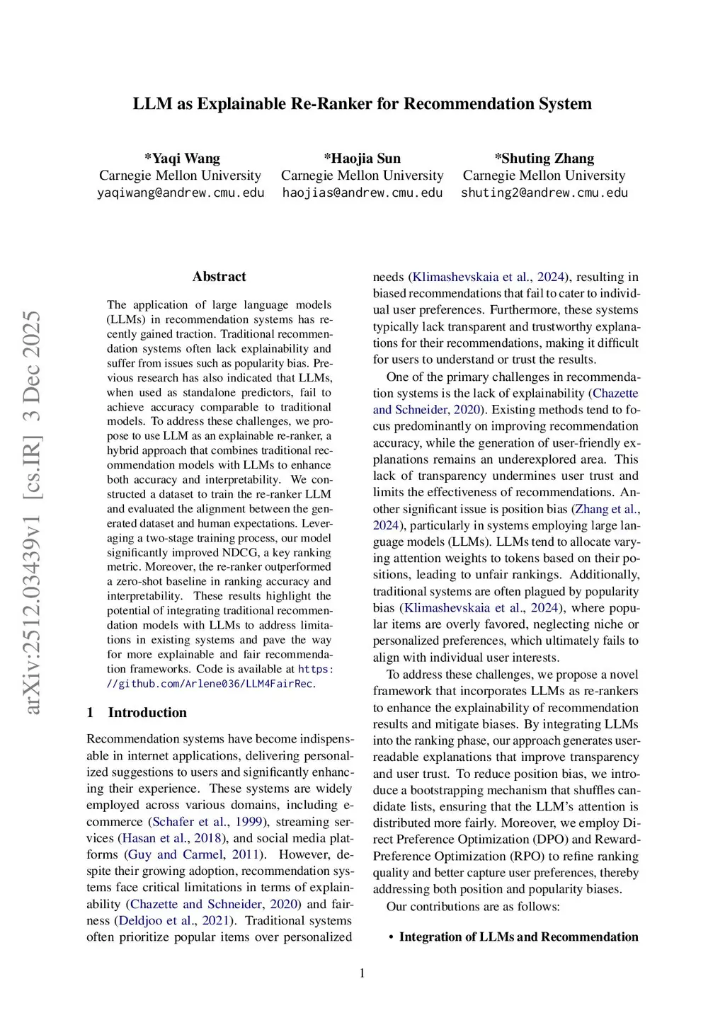 The application of large language models (LLMs) in recommendation systems has recently gained traction. Traditional recommendation systems often lack explainability and suffer from issues such as popularity bias. Previous research has also indicated that LLMs, when used as standalone predictors, fail to achieve accuracy comparable to traditional models. To address these challenges, we propose to use LLM as an explainable re-ranker, a hybrid approach that combines traditional recommendation models with LLMs to enhance both accuracy and interpretability. We constructed a dataset to train the re-ranker LLM and evaluated the alignment between the generated dataset and human expectations. Leveraging a two-stage training process, our model significantly improved NDCG, a key ranking metric. Moreover, the re-ranker outperformed a zero-shot baseline in ranking accuracy and interpretability. These results highlight the potential of integrating traditional recommendation models with LLMs to address limitations in existing systems and pave the way for more explainable and fair recommendation frameworks.