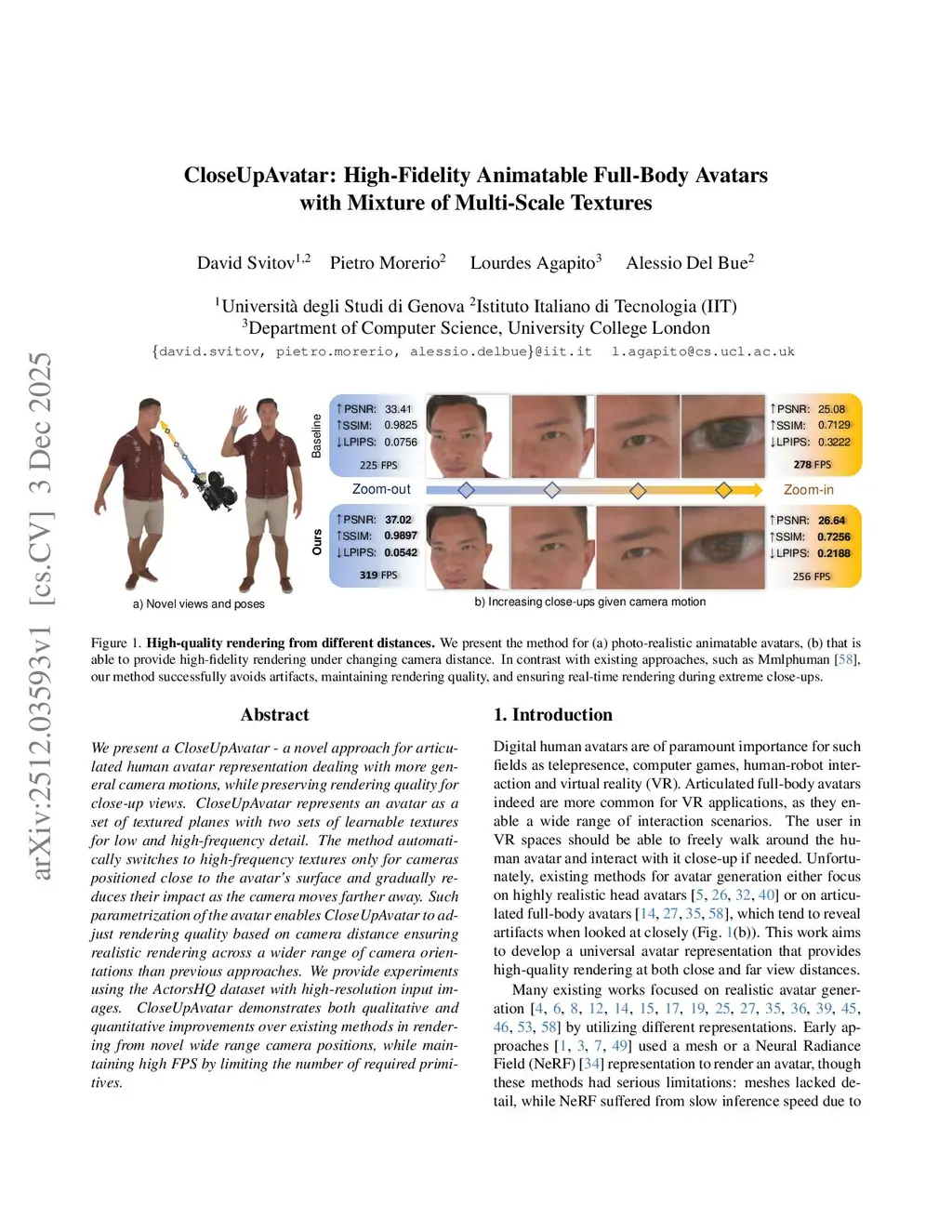 We present a CloseUpAvatar - a novel approach for articulated human avatar representation dealing with more general camera motions, while preserving rendering quality for close-up views. CloseUpAvatar represents an avatar as a set of textured planes with two sets of learnable textures for low and high-frequency detail. The method automatically switches to high-frequency textures only for cameras positioned close to the avatar's surface and gradually reduces their impact as the camera moves farther away. Such parametrization of the avatar enables CloseUpAvatar to adjust rendering quality based on camera distance ensuring realistic rendering across a wider range of camera orientations than previous approaches. We provide experiments using the ActorsHQ dataset with high-resolution input images. CloseUpAvatar demonstrates both qualitative and quantitative improvements over existing methods in rendering from novel wide range camera positions, while maintaining high FPS by limiting the number of required primitives.
