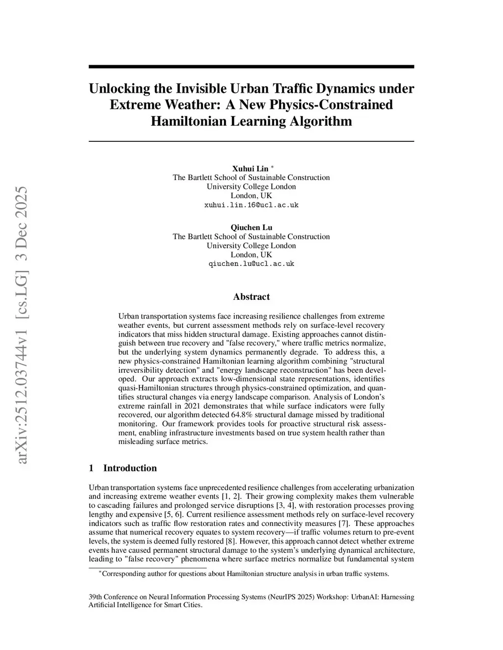 Urban transportation systems face increasing resilience challenges from extreme weather events, but current assessment methods rely on surface-level recovery indicators that miss hidden structural damage. Existing approaches cannot distinguish between true recovery and "false recovery," where traffic metrics normalize, but the underlying system dynamics permanently degrade. To address this, a new physics-constrained Hamiltonian learning algorithm combining "structural irreversibility detection" and "energy landscape reconstruction" has been developed. Our approach extracts low-dimensional state representations, identifies quasi-Hamiltonian structures through physics-constrained optimization, and quantifies structural changes via energy landscape comparison. Analysis of London's extreme rainfall in 2021 demonstrates that while surface indicators were fully recovered, our algorithm detected 64.8\% structural damage missed by traditional monitoring. Our framework provides tools for proactive structural risk assessment, enabling infrastructure investments based on true system health rather than misleading surface metrics.