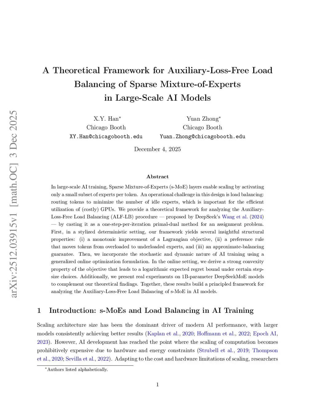 A Theoretical Framework for Auxiliary-Loss-Free Load Balancing of Sparse Mixture-of-Experts in Large-Scale AI Models