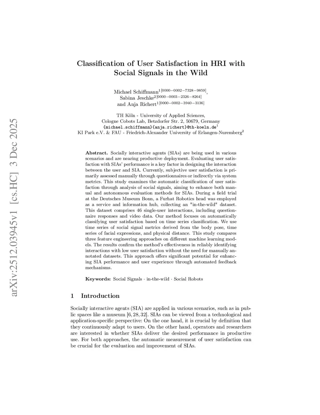 Socially interactive agents (SIAs) are being used in various scenarios and are nearing productive deployment. Evaluating user satisfaction with SIAs' performance is a key factor in designing the interaction between the user and SIA. Currently, subjective user satisfaction is primarily assessed manually through questionnaires or indirectly via system metrics. This study examines the automatic classification of user satisfaction through analysis of social signals, aiming to enhance both manual and autonomous evaluation methods for SIAs. During a field trial at the Deutsches Museum Bonn, a Furhat Robotics head was employed as a service and information hub, collecting an "in-the-wild" dataset. This dataset comprises 46 single-user interactions, including questionnaire responses and video data. Our method focuses on automatically classifying user satisfaction based on time series classification. We use time series of social signal metrics derived from the body pose, time series of facial expressions, and physical distance. This study compares three feature engineering approaches on different machine learning models. The results confirm the method's effectiveness in reliably identifying interactions with low user satisfaction without the need for manually annotated datasets. This approach offers significant potential for enhancing SIA performance and user experience through automated feedback mechanisms.