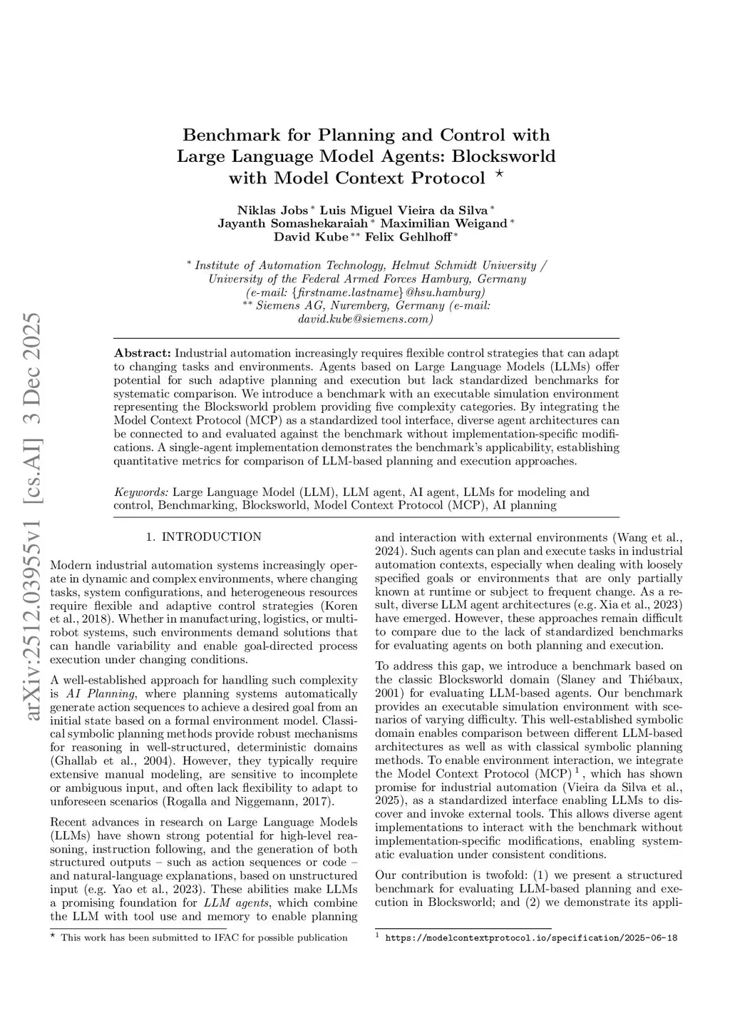 Industrial automation increasingly requires flexible control strategies that can adapt to changing tasks and environments. Agents based on Large Language Models (LLMs) offer potential for such adaptive planning and execution but lack standardized benchmarks for systematic comparison. We introduce a benchmark with an executable simulation environment representing the Blocksworld problem providing five complexity categories. By integrating the Model Context Protocol (MCP) as a standardized tool interface, diverse agent architectures can be connected to and evaluated against the benchmark without implementation-specific modifications. A single-agent implementation demonstrates the benchmark's applicability, establishing quantitative metrics for comparison of LLM-based planning and execution approaches.