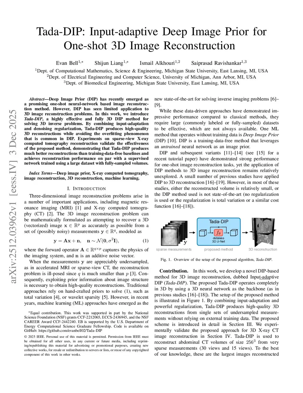Tada-DIP: Input-adaptive Deep Image Prior for One-shot 3D Image Reconstruction