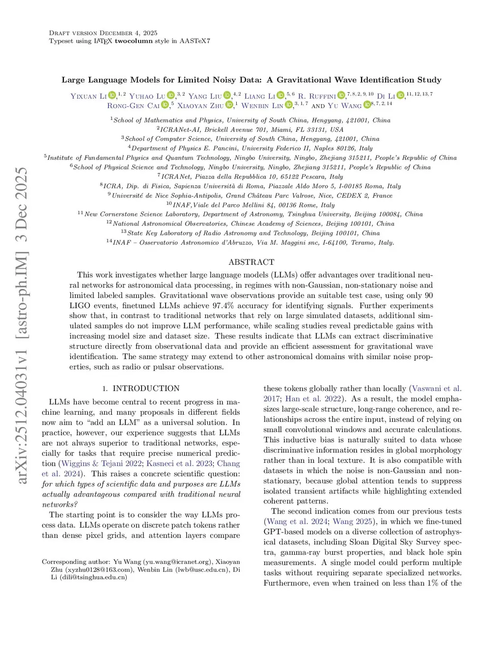 This work investigates whether large language models (LLMs) offer advantages over traditional neural networks for astronomical data processing, in regimes with non-Gaussian, non-stationary noise and limited labeled samples. Gravitational wave observations provide an suitable test case, using only 90 LIGO events, finetuned LLMs achieve 97.4\% accuracy for identifying signals. Further experiments show that, in contrast to traditional networks that rely on large simulated datasets, additional simulated samples do not improve LLM performance, while scaling studies reveal predictable gains with increasing model size and dataset size. These results indicate that LLMs can extract discriminative structure directly from observational data and provide an efficient assessment for gravitational wave identification. The same strategy may extend to other astronomical domains with similar noise properties, such as radio or pulsar observations.