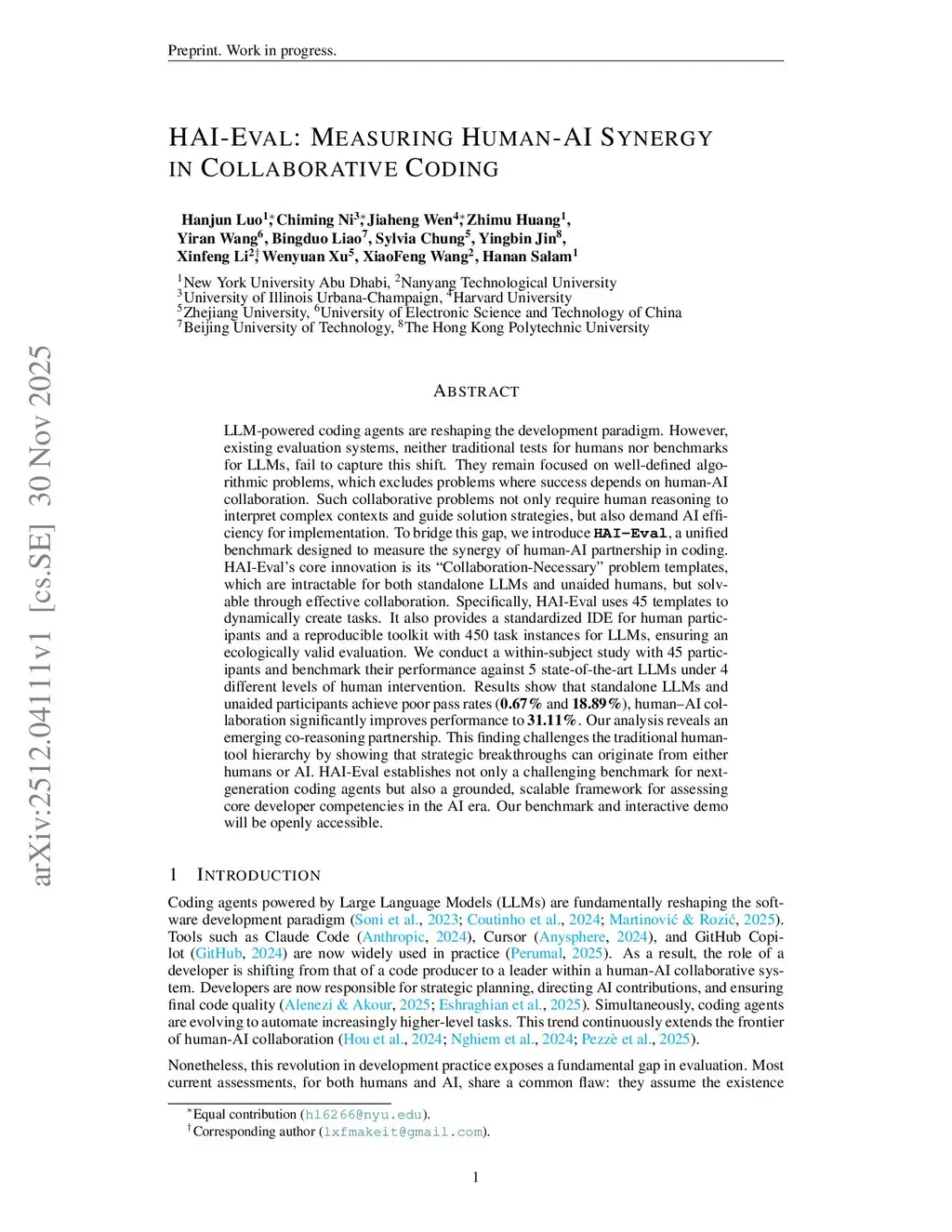 LLM-powered coding agents are reshaping the development paradigm. However, existing evaluation systems, neither traditional tests for humans nor benchmarks for LLMs, fail to capture this shift. They remain focused on well-defined algorithmic problems, which excludes problems where success depends on human-AI collaboration. Such collaborative problems not only require human reasoning to interpret complex contexts and guide solution strategies, but also demand AI efficiency for implementation. To bridge this gap, we introduce HAI-Eval, a unified benchmark designed to measure the synergy of human-AI partnership in coding. HAI-Eval's core innovation is its "Collaboration-Necessary" problem templates, which are intractable for both standalone LLMs and unaided humans, but solvable through effective collaboration. Specifically, HAI-Eval uses 45 templates to dynamically create tasks. It also provides a standardized IDE for human participants and a reproducible toolkit with 450 task instances for LLMs, ensuring an ecologically valid evaluation. We conduct a within-subject study with 45 participants and benchmark their performance against 5 state-of-the-art LLMs under 4 different levels of human intervention. Results show that standalone LLMs and unaided participants achieve poor pass rates (0.67% and 18.89%), human-AI collaboration significantly improves performance to 31.11%. Our analysis reveals an emerging co-reasoning partnership. This finding challenges the traditional human-tool hierarchy by showing that strategic breakthroughs can originate from either humans or AI. HAI-Eval establishes not only a challenging benchmark for next-generation coding agents but also a grounded, scalable framework for assessing core developer competencies in the AI era. Our benchmark and interactive demo will be openly accessible.