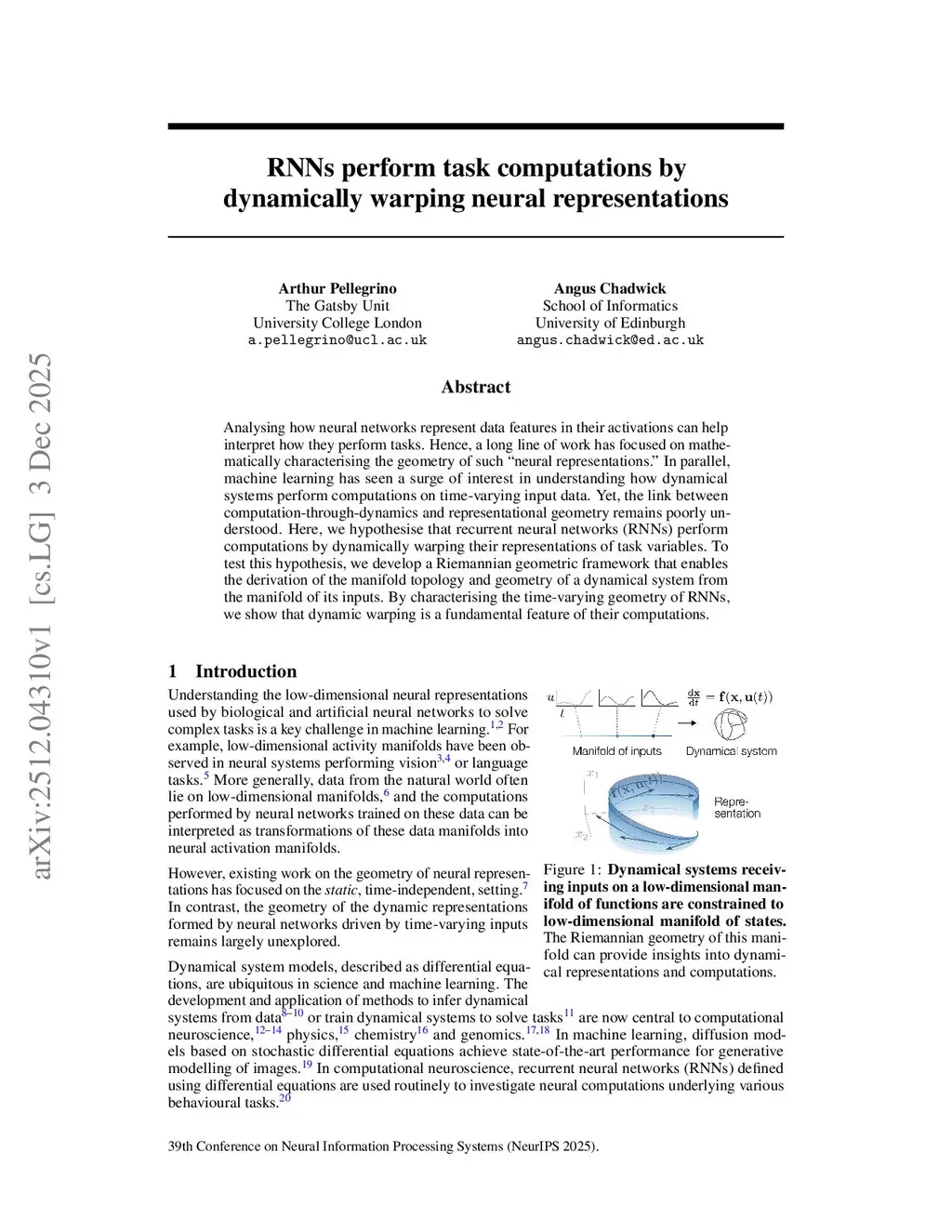 Analysing how neural networks represent data features in their activations can help interpret how they perform tasks. Hence, a long line of work has focused on mathematically characterising the geometry of such "neural representations." In parallel, machine learning has seen a surge of interest in understanding how dynamical systems perform computations on time-varying input data. Yet, the link between computation-through-dynamics and representational geometry remains poorly understood. Here, we hypothesise that recurrent neural networks (RNNs) perform computations by dynamically warping their representations of task variables. To test this hypothesis, we develop a Riemannian geometric framework that enables the derivation of the manifold topology and geometry of a dynamical system from the manifold of its inputs. By characterising the time-varying geometry of RNNs, we show that dynamic warping is a fundamental feature of their computations.