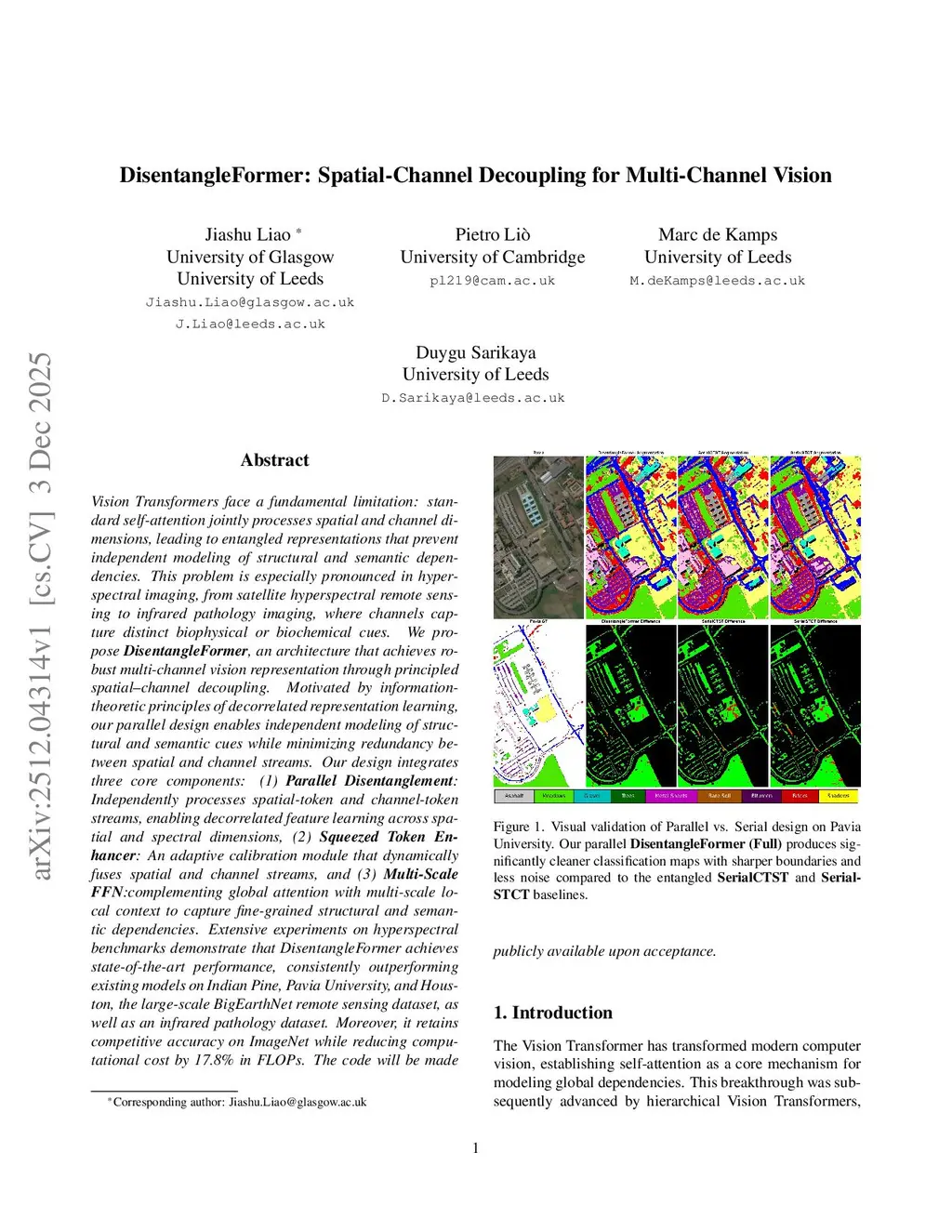 Vision Transformers face a fundamental limitation: standard self-attention jointly processes spatial and channel dimensions, leading to entangled representations that prevent independent modeling of structural and semantic dependencies. This problem is especially pronounced in hyperspectral imaging, from satellite hyperspectral remote sensing to infrared pathology imaging, where channels capture distinct biophysical or biochemical cues. We propose DisentangleFormer, an architecture that achieves robust multi-channel vision representation through principled spatial-channel decoupling. Motivated by information-theoretic principles of decorrelated representation learning, our parallel design enables independent modeling of structural and semantic cues while minimizing redundancy between spatial and channel streams. Our design integrates three core components: (1) Parallel Disentanglement: Independently processes spatial-token and channel-token streams, enabling decorrelated feature learning across spatial and spectral dimensions, (2) Squeezed Token Enhancer: An adaptive calibration module that dynamically fuses spatial and channel streams, and (3) Multi-Scale FFN: complementing global attention with multi-scale local context to capture fine-grained structural and semantic dependencies. Extensive experiments on hyperspectral benchmarks demonstrate that DisentangleFormer achieves state-of-the-art performance, consistently outperforming existing models on Indian Pine, Pavia University, and Houston, the large-scale BigEarthNet remote sensing dataset, as well as an infrared pathology dataset. Moreover, it retains competitive accuracy on ImageNet while reducing computational cost by 17.8% in FLOPs. The code will be made publicly available upon acceptance.