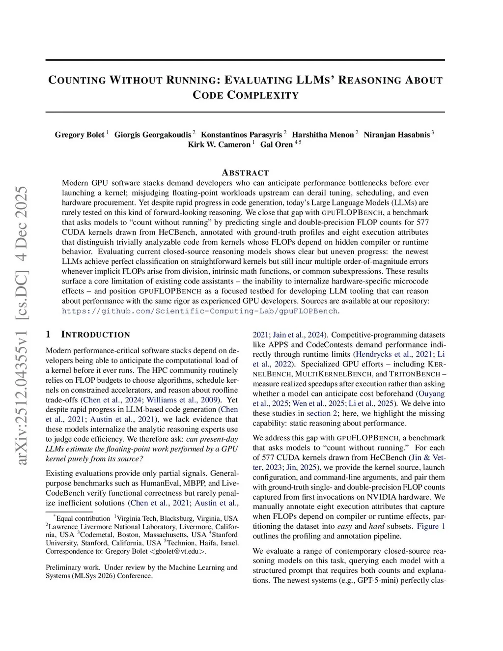Modern GPU software stacks demand developers who can anticipate performance bottlenecks before ever launching a kernel; misjudging floating-point workloads upstream can derail tuning, scheduling, and even hardware procurement. Yet despite rapid progress in code generation, today's Large Language Models (LLMs) are rarely tested on this kind of forward-looking reasoning. We close that gap with gpuFLOPBench, a benchmark that asks models to "count without running" by predicting single and double-precision FLOP counts for 577 CUDA kernels drawn from HeCBench, annotated with ground-truth profiles and eight execution attributes that distinguish trivially analyzable code from kernels whose FLOPs depend on hidden compiler or runtime behavior. Evaluating current closed-source reasoning models shows clear but uneven progress: the newest LLMs achieve perfect classification on straightforward kernels but still incur multiple order-of-magnitude errors whenever implicit FLOPs arise from division, intrinsic math functions, or common subexpressions. These results surface a core limitation of existing code assistants -- the inability to internalize hardware-specific microcode effects -- and position gpuFLOPBench as a focused testbed for developing LLM tooling that can reason about performance with the same rigor as experienced GPU developers. Sources are available at our repository:this https URL
