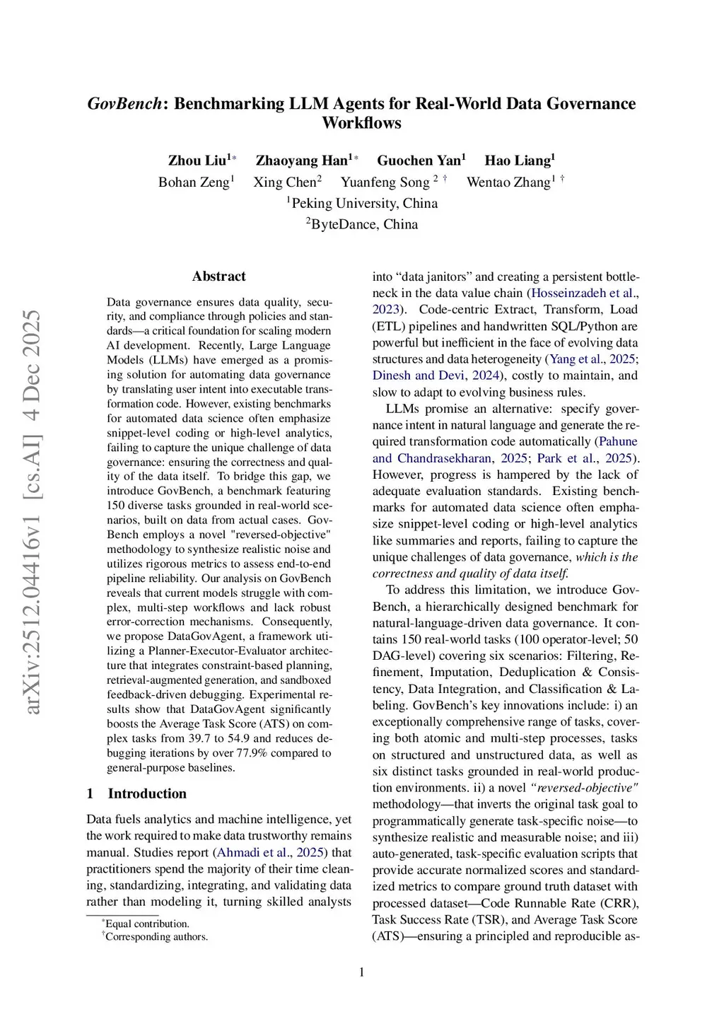 Data governance ensures data quality, security, and compliance through policies and standards, a critical foundation for scaling modern AI development. Recently, large language models (LLMs) have emerged as a promising solution for automating data governance by translating user intent into executable transformation code. However, existing benchmarks for automated data science often emphasize snippet-level coding or high-level analytics, failing to capture the unique challenge of data governance: ensuring the correctness and quality of the data itself. To bridge this gap, we introduce GovBench, a benchmark featuring 150 diverse tasks grounded in real-world scenarios, built on data from actual cases. GovBench employs a novel "reversed-objective" methodology to synthesize realistic noise and utilizes rigorous metrics to assess end-to-end pipeline reliability. Our analysis on GovBench reveals that current models struggle with complex, multi-step workflows and lack robust error-correction mechanisms. Consequently, we propose DataGovAgent, a framework utilizing a Planner-Executor-Evaluator architecture that integrates constraint-based planning, retrieval-augmented generation, and sandboxed feedback-driven debugging. Experimental results show that DataGovAgent significantly boosts the Average Task Score (ATS) on complex tasks from 39.7 to 54.9 and reduces debugging iterations by over 77.9 percent compared to general-purpose baselines.