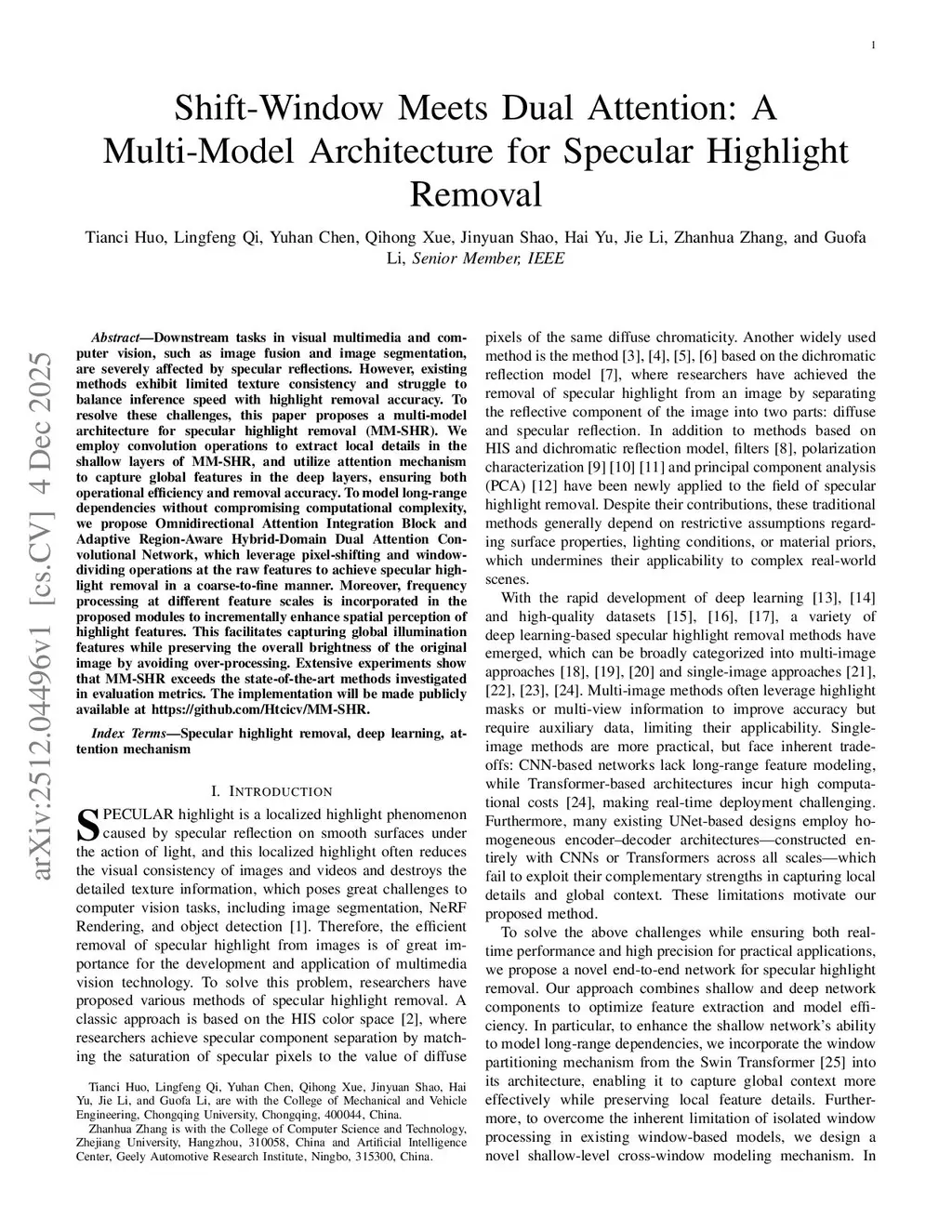 Shift-Window Meets Dual Attention: A Multi-Model Architecture for Specular Highlight Removal