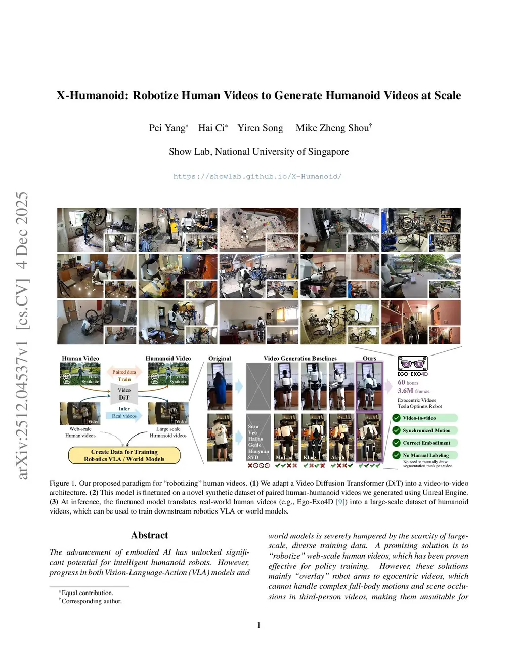 The advancement of embodied AI has unlocked significant potential for intelligent humanoid robots. However, progress in both Vision-Language-Action (VLA) models and world models is severely hampered by the scarcity of large-scale, diverse training data. A promising solution is to "robotize" web-scale human videos, which has been proven effective for policy training. However, these solutions mainly "overlay" robot arms to egocentric videos, which cannot handle complex full-body motions and scene occlusions in third-person videos, making them unsuitable for robotizing humans. To bridge this gap, we introduce X-Humanoid, a generative video editing approach that adapts the powerful Wan 2.2 model into a video-to-video structure and finetunes it for the human-to-humanoid translation task. This finetuning requires paired human-humanoid videos, so we designed a scalable data creation pipeline, turning community assets into 17+ hours of paired synthetic videos using Unreal Engine. We then apply our trained model to 60 hours of the Ego-Exo4D videos, generating and releasing a new large-scale dataset of over 3.6 million "robotized" humanoid video frames. Quantitative analysis and user studies confirm our method's superiority over existing baselines: 69% of users rated it best for motion consistency, and 62.1% for embodiment correctness.