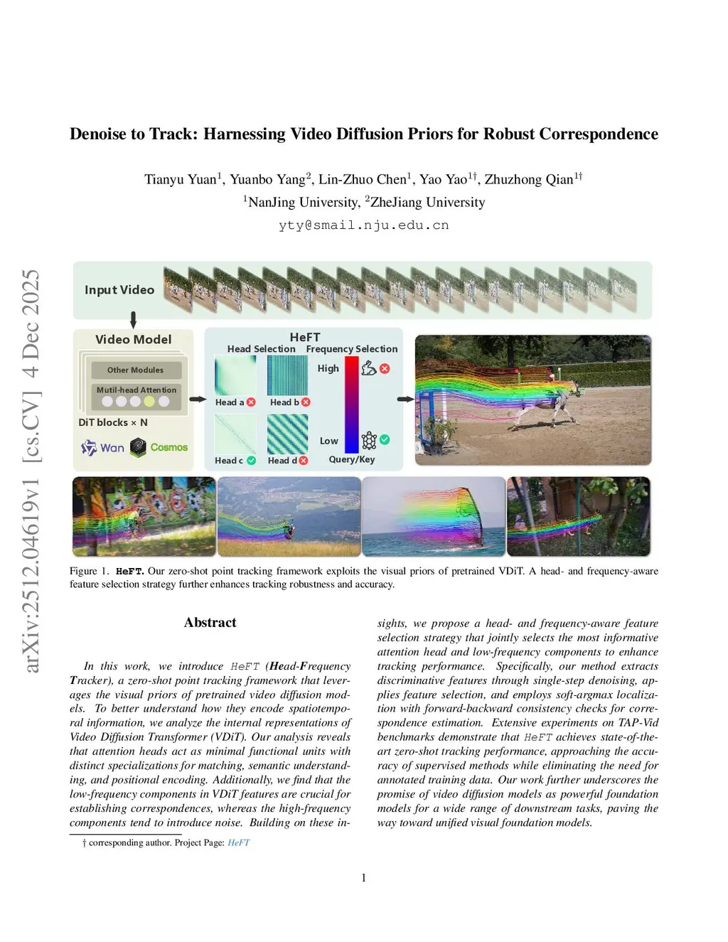 In this work, we introduce HeFT (Head-Frequency Tracker), a zero-shot point tracking framework that leverages the visual priors of pretrained video diffusion models. To better understand how they encode spatiotemporal information, we analyze the internal representations of Video Diffusion Transformer (VDiT). Our analysis reveals that attention heads act as minimal functional units with distinct specializations for matching, semantic understanding, and positional encoding. Additionally, we find that the low-frequency components in VDiT features are crucial for establishing correspondences, whereas the high-frequency components tend to introduce noise. Building on these insights, we propose a head- and frequency-aware feature selection strategy that jointly selects the most informative attention head and low-frequency components to enhance tracking performance. Specifically, our method extracts discriminative features through single-step denoising, applies feature selection, and employs soft-argmax localization with forward-backward consistency checks for correspondence estimation. Extensive experiments on TAP-Vid benchmarks demonstrate that HeFT achieves state-of-the-art zero-shot tracking performance, approaching the accuracy of supervised methods while eliminating the need for annotated training data. Our work further underscores the promise of video diffusion models as powerful foundation models for a wide range of downstream tasks, paving the way toward unified visual foundation models.