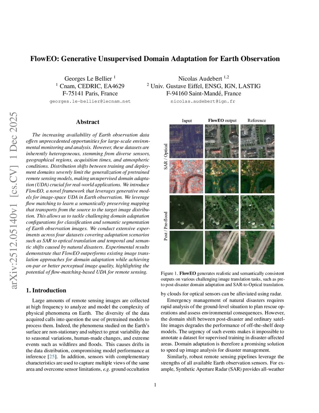 The increasing availability of Earth observation data offers unprecedented opportunities for large-scale environmental monitoring and analysis. However, these datasets are inherently heterogeneous, stemming from diverse sensors, geographical regions, acquisition times, and atmospheric conditions. Distribution shifts between training and deployment domains severely limit the generalization of pretrained remote sensing models, making unsupervised domain adaptation (UDA) crucial for real-world applications. We introduce FlowEO, a novel framework that leverages generative models for image-space UDA in Earth observation. We leverage flow matching to learn a semantically preserving mapping that transports from the source to the target image distribution. This allows us to tackle challenging domain adaptation configurations for classification and semantic segmentation of Earth observation images. We conduct extensive experiments across four datasets covering adaptation scenarios such as SAR to optical translation and temporal and semantic shifts caused by natural disasters. Experimental results demonstrate that FlowEO outperforms existing image translation approaches for domain adaptation while achieving on-par or better perceptual image quality, highlighting the potential of flow-matching-based UDA for remote sensing.