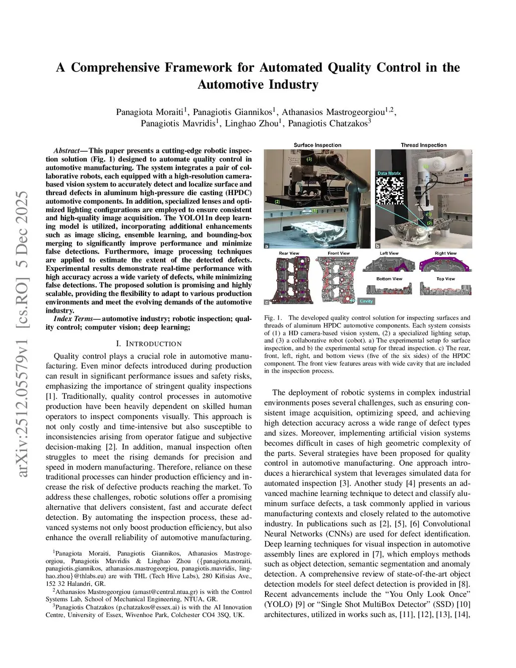 This paper presents a cutting-edge robotic inspection solution designed to automate quality control in automotive manufacturing. The system integrates a pair of collaborative robots, each equipped with a high-resolution camera-based vision system to accurately detect and localize surface and thread defects in aluminum high-pressure die casting (HPDC) automotive components. In addition, specialized lenses and optimized lighting configurations are employed to ensure consistent and high-quality image acquisition. The YOLO11n deep learning model is utilized, incorporating additional enhancements such as image slicing, ensemble learning, and bounding-box merging to significantly improve performance and minimize false detections. Furthermore, image processing techniques are applied to estimate the extent of the detected defects. Experimental results demonstrate real-time performance with high accuracy across a wide variety of defects, while minimizing false detections. The proposed solution is promising and highly scalable, providing the flexibility to adapt to various production environments and meet the evolving demands of the automotive industry.