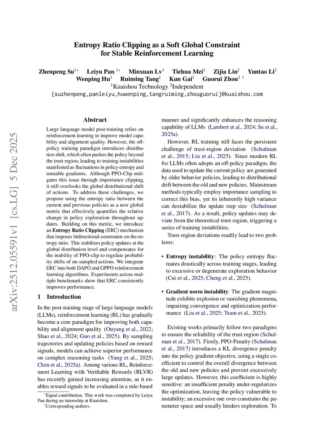 Large language model post-training relies on reinforcement learning to improve model capability and alignment quality. However, the off-policy training paradigm introduces distribution shift, which often pushes the policy beyond the trust region, leading to training instabilities manifested as fluctuations in policy entropy and unstable gradients. Although PPO-Clip mitigates this issue through importance clipping, it still overlooks the global distributional shift of actions. To address these challenges, we propose using the entropy ratio between the current and previous policies as a new global metric that effectively quantifies the relative change in policy exploration throughout updates. Building on this metric, we introduce an \textbf{Entropy Ratio Clipping} (ERC) mechanism that imposes bidirectional constraints on the entropy ratio. This stabilizes policy updates at the global distribution level and compensates for the inability of PPO-clip to regulate probability shifts of un-sampled actions. We integrate ERC into both DAPO and GPPO reinforcement learning algorithms. Experiments across multiple benchmarks show that ERC consistently improves performance.