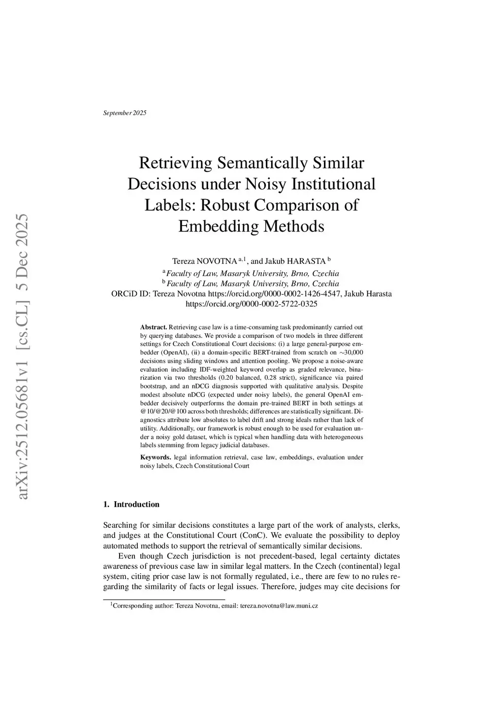 Retrieving case law is a time-consuming task predominantly carried out by querying databases. We provide a comparison of two models in three different settings for Czech Constitutional Court decisions: (i) a large general-purpose embedder (OpenAI), (ii) a domain-specific BERT-trained from scratch on ~30,000 decisions using sliding windows and attention pooling. We propose a noise-aware evaluation including IDF-weighted keyword overlap as graded relevance, binarization via two thresholds (0.20 balanced, 0.28 strict), significance via paired bootstrap, and an nDCG diagnosis supported with qualitative analysis. Despite modest absolute nDCG (expected under noisy labels), the general OpenAI embedder decisively outperforms the domain pre-trained BERT in both settings at @10/@20/@100 across both thresholds; differences are statistically significant. Diagnostics attribute low absolutes to label drift and strong ideals rather than lack of utility. Additionally, our framework is robust enough to be used for evaluation under a noisy gold dataset, which is typical when handling data with heterogeneous labels stemming from legacy judicial databases.