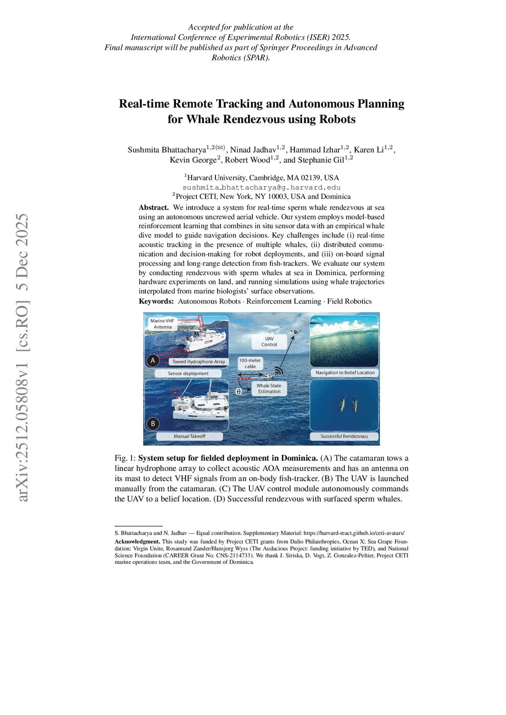 We introduce a system for real-time sperm whale rendezvous at sea using an autonomous uncrewed aerial vehicle. Our system employs model-based reinforcement learning that combines in situ sensor data with an empirical whale dive model to guide navigation decisions. Key challenges include (i) real-time acoustic tracking in the presence of multiple whales, (ii) distributed communication and decision-making for robot deployments, and (iii) on-board signal processing and long-range detection from fish-trackers. We evaluate our system by conducting rendezvous with sperm whales at sea in Dominica, performing hardware experiments on land, and running simulations using whale trajectories interpolated from marine biologists' surface observations.