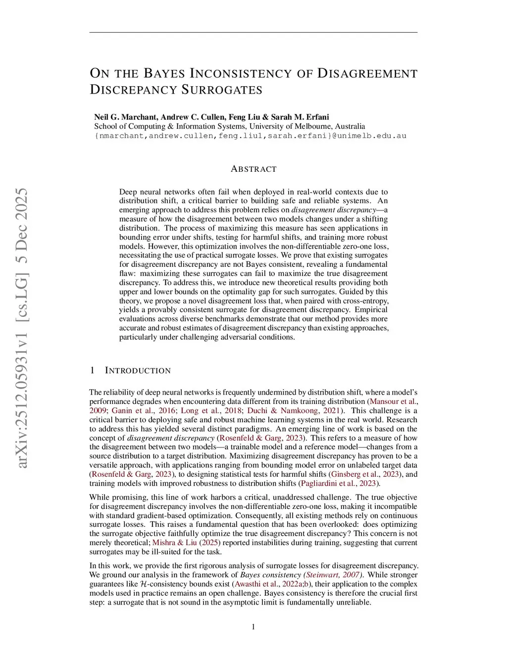 Deep neural networks often fail when deployed in real-world contexts due to distribution shift, a critical barrier to building safe and reliable systems. An emerging approach to address this problem relies on \emph{disagreement discrepancy} -- a measure of how the disagreement between two models changes under a shifting distribution. The process of maximizing this measure has seen applications in bounding error under shifts, testing for harmful shifts, and training more robust models. However, this optimization involves the non-differentiable zero-one loss, necessitating the use of practical surrogate losses. We prove that existing surrogates for disagreement discrepancy are not Bayes consistent, revealing a fundamental flaw: maximizing these surrogates can fail to maximize the true disagreement discrepancy. To address this, we introduce new theoretical results providing both upper and lower bounds on the optimality gap for such surrogates. Guided by this theory, we propose a novel disagreement loss that, when paired with cross-entropy, yields a provably consistent surrogate for disagreement discrepancy. Empirical evaluations across diverse benchmarks demonstrate that our method provides more accurate and robust estimates of disagreement discrepancy than existing approaches, particularly under challenging adversarial conditions.