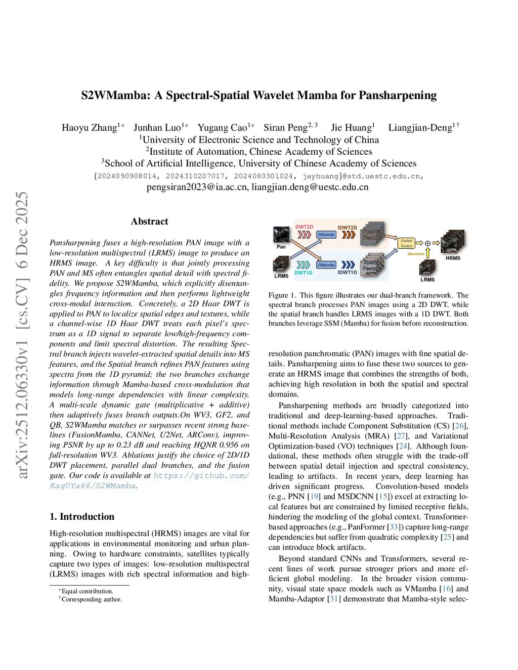 Pansharpening fuses a high-resolution PAN image with a low-resolution multispectral (LRMS) image to produce an HRMS image. A key difficulty is that jointly processing PAN and MS often entangles spatial detail with spectral fidelity. We propose S2WMamba, which explicitly disentangles frequency information and then performs lightweight cross-modal interaction. Concretely, a 2D Haar DWT is applied to PAN to localize spatial edges and textures, while a channel-wise 1D Haar DWT treats each pixel's spectrum as a 1D signal to separate low/high-frequency components and limit spectral distortion. The resulting Spectral branch injects wavelet-extracted spatial details into MS features, and the Spatial branch refines PAN features using spectra from the 1D pyramid; the two branches exchange information through Mamba-based cross-modulation that models long-range dependencies with linear complexity. A multi-scale dynamic gate (multiplicative + additive) then adaptively fuses branchthis http URLWV3, GF2, and QB, S2WMamba matches or surpasses recent strong baselines (FusionMamba, CANNet, U2Net, ARConv), improving PSNR by up to 0.23 dB and reaching HQNR 0.956 on full-resolution WV3. Ablations justify the choice of 2D/1D DWT placement, parallel dual branches, and the fusion gate. Our code is available atthis https URL.