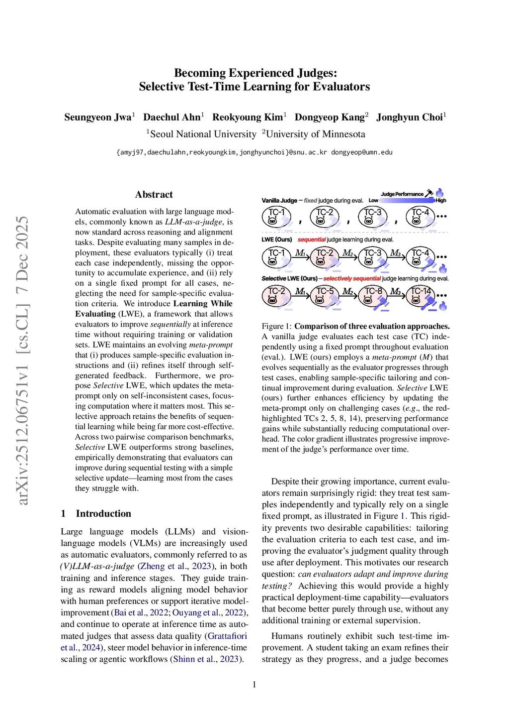 Automatic evaluation with large language models, commonly known as LLM-as-a-judge, is now standard across reasoning and alignment tasks. Despite evaluating many samples in deployment, these evaluators typically (i) treat each case independently, missing the opportunity to accumulate experience, and (ii) rely on a single fixed prompt for all cases, neglecting the need for sample-specific evaluation criteria. We introduce Learning While Evaluating (LWE), a framework that allows evaluators to improve sequentially at inference time without requiring training or validation sets. LWE maintains an evolving meta-prompt that (i) produces sample-specific evaluation instructions and (ii) refines itself through self-generated feedback. Furthermore, we propose Selective LWE, which updates the meta-prompt only on self-inconsistent cases, focusing computation where it matters most. This selective approach retains the benefits of sequential learning while being far more cost-effective. Across two pairwise comparison benchmarks, Selective LWE outperforms strong baselines, empirically demonstrating that evaluators can improve during sequential testing with a simple selective update, learning most from the cases they struggle with.