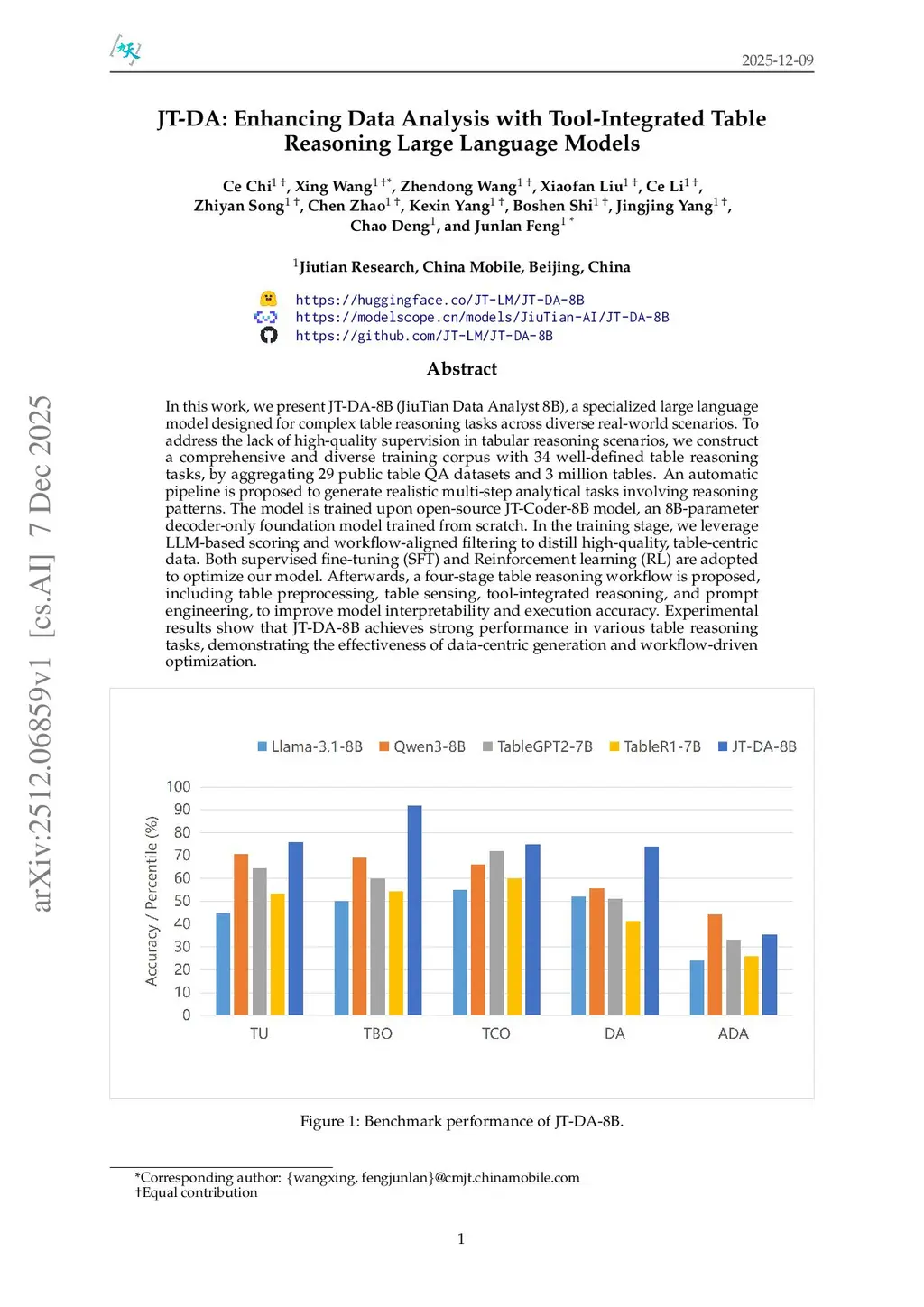 JT-DA: Enhancing Data Analysis with Tool-Integrated Table Reasoning Large Language Models