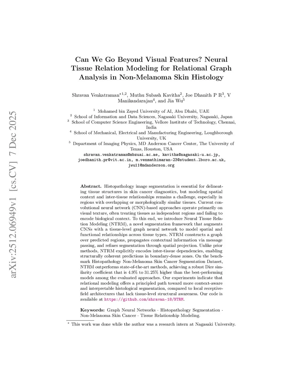 Histopathology image segmentation is essential for delineating tissue structures in skin cancer diagnostics, but modeling spatial context and inter-tissue relationships remains a challenge, especially in regions with overlapping or morphologically similar tissues. Current convolutional neural network (CNN)-based approaches operate primarily on visual texture, often treating tissues as independent regions and failing to encode biological context. To this end, we introduce Neural Tissue Relation Modeling (NTRM), a novel segmentation framework that augments CNNs with a tissue-level graph neural network to model spatial and functional relationships across tissue types. NTRM constructs a graph over predicted regions, propagates contextual information via message passing, and refines segmentation through spatial projection. Unlike prior methods, NTRM explicitly encodes inter-tissue dependencies, enabling structurally coherent predictions in boundary-dense zones. On the benchmark Histopathology Non-Melanoma Skin Cancer Segmentation Dataset, NTRM outperforms state-of-the-art methods, achieving a robust Dice similarity coefficient that is 4.9\% to 31.25\% higher than the best-performing models among the evaluated approaches. Our experiments indicate that relational modeling offers a principled path toward more context-aware and interpretable histological segmentation, compared to local receptive-field architectures that lack tissue-level structural awareness. Our code is available atthis https URL.