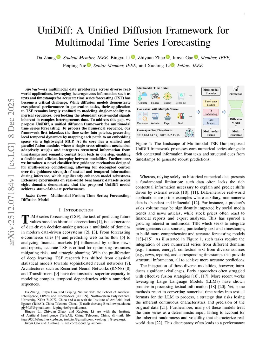 As multimodal data proliferates across diverse real-world applications, leveraging heterogeneous information such as texts and timestamps for accurate time series forecasting (TSF) has become a critical challenge. While diffusion models demonstrate exceptional performance in generation tasks, their application to TSF remains largely confined to modeling single-modality numerical sequences, overlooking the abundant cross-modal signals inherent in complex heterogeneous data. To address this gap, we propose UniDiff, a unified diffusion framework for multimodal time series forecasting. To process the numerical sequence, our framework first tokenizes the time series into patches, preserving local temporal dynamics by mapping each patch to an embedding space via a lightweight MLP. At its core lies a unified and parallel fusion module, where a single cross-attention mechanism adaptively weighs and integrates structural information from timestamps and semantic context from texts in one step, enabling a flexible and efficient interplay between modalities. Furthermore, we introduce a novel classifier-free guidance mechanism designed for multi-source conditioning, allowing for decoupled control over the guidance strength of textual and temporal information during inference, which significantly enhances model robustness. Extensive experiments on real-world benchmark datasets across eight domains demonstrate that the proposed UniDiff model achieves state-of-the-art performance.