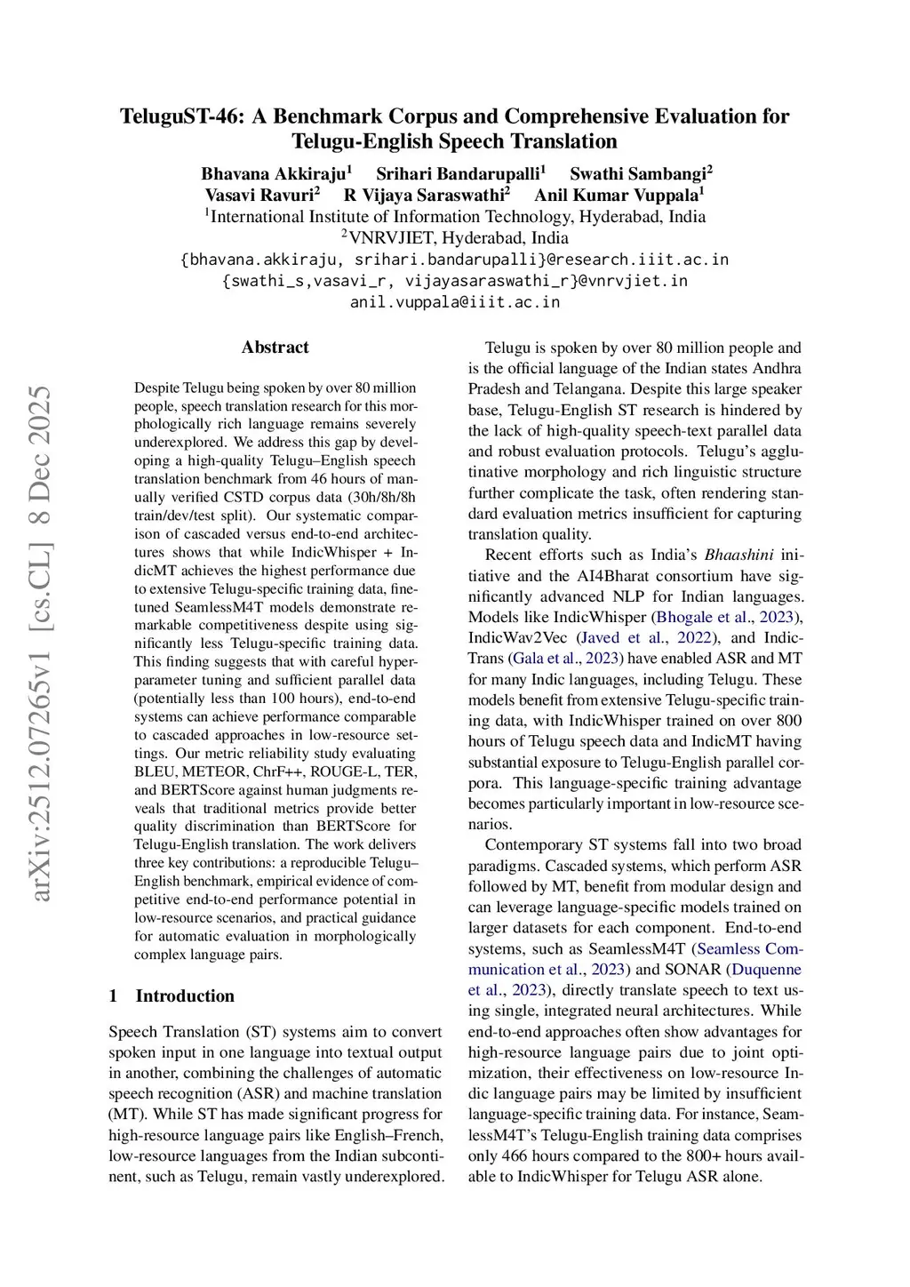 Despite Telugu being spoken by over 80 million people, speech translation research for this morphologically rich language remains severely underexplored. We address this gap by developing a high-quality Telugu--English speech translation benchmark from 46 hours of manually verified CSTD corpus data (30h/8h/8h train/dev/test split). Our systematic comparison of cascaded versus end-to-end architectures shows that while IndicWhisper + IndicMT achieves the highest performance due to extensive Telugu-specific training data, finetuned SeamlessM4T models demonstrate remarkable competitiveness despite using significantly less Telugu-specific training data. This finding suggests that with careful hyperparameter tuning and sufficient parallel data (potentially less than 100 hours), end-to-end systems can achieve performance comparable to cascaded approaches in low-resource settings. Our metric reliability study evaluating BLEU, METEOR, ChrF++, ROUGE-L, TER, and BERTScore against human judgments reveals that traditional metrics provide better quality discrimination than BERTScore for Telugu--English translation. The work delivers three key contributions: a reproducible Telugu--English benchmark, empirical evidence of competitive end-to-end performance potential in low-resource scenarios, and practical guidance for automatic evaluation in morphologically complex language pairs.