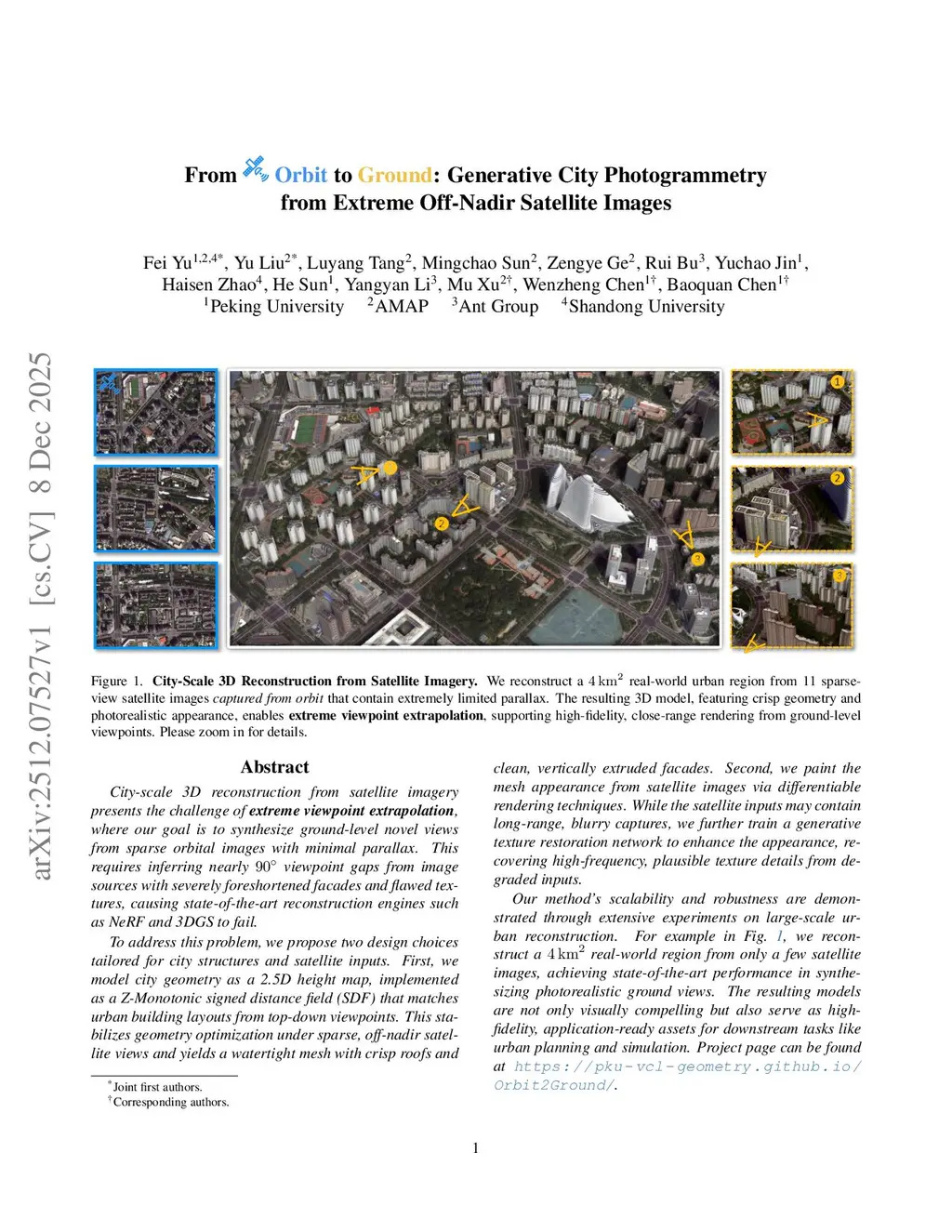 City-scale 3D reconstruction from satellite imagery presents the challenge of extreme viewpoint extrapolation, where our goal is to synthesize ground-level novel views from sparse orbital images with minimal parallax. This requires inferring nearly viewpoint gaps from image sources with severely foreshortened facades and flawed textures, causing state-of-the-art reconstruction engines such as NeRF and 3DGS to fail. To address this problem, we propose two design choices tailored for city structures and satellite inputs. First, we model city geometry as a 2.5D height map, implemented as a Z-monotonic signed distance field (SDF) that matches urban building layouts from top-down viewpoints. This stabilizes geometry optimization under sparse, off-nadir satellite views and yields a watertight mesh with crisp roofs and clean, vertically extruded facades. Second, we paint the mesh appearance from satellite images via differentiable rendering techniques. While the satellite inputs may contain long-range, blurry captures, we further train a generative texture restoration network to enhance the appearance, recovering high-frequency, plausible texture details from degraded inputs. Our method's scalability and robustness are demonstrated through extensive experiments on large-scale urban reconstruction. For example, in our teaser figure, we reconstruct a real-world region from only a few satellite images, achieving state-of-the-art performance in synthesizing photorealistic ground views. The resulting models are not only visually compelling but also serve as high-fidelity, application-ready assets for downstream tasks like urban planning and simulation. Project page can be found atthis https URL.