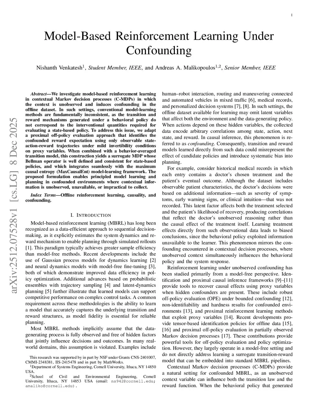 We investigate model-based reinforcement learning in contextual Markov decision processes (C-MDPs) in which the context is unobserved and induces confounding in the offline dataset. In such settings, conventional model-learning methods are fundamentally inconsistent, as the transition and reward mechanisms generated under a behavioral policy do not correspond to the interventional quantities required for evaluating a state-based policy. To address this issue, we adapt a proximal off-policy evaluation approach that identifies the confounded reward expectation using only observable state-action-reward trajectories under mild invertibility conditions on proxy variables. When combined with a behavior-averaged transition model, this construction yields a surrogate MDP whose Bellman operator is well defined and consistent for state-based policies, and which integrates seamlessly with the maximum causal entropy (MaxCausalEnt) model-learning framework. The proposed formulation enables principled model learning and planning in confounded environments where contextual information is unobserved, unavailable, or impractical to collect.